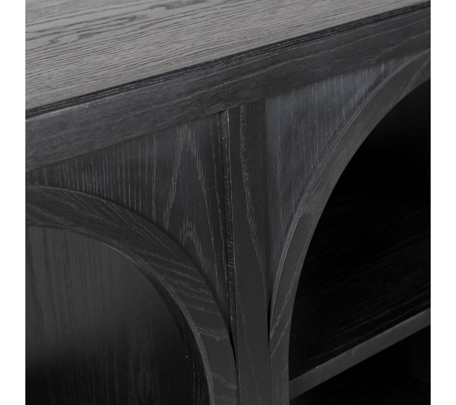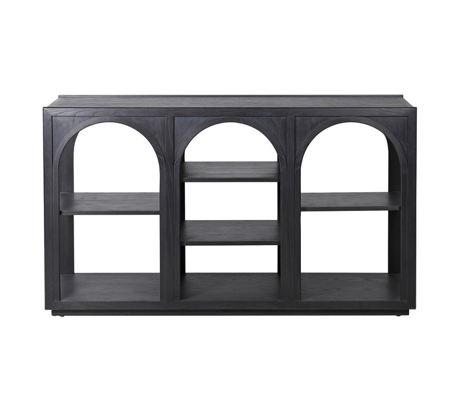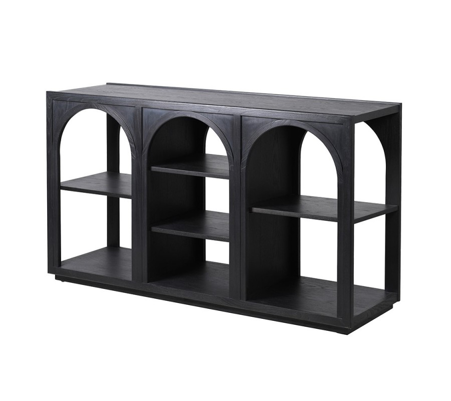 Luxusný konzolový stolík má obdĺžnikový tvar s výraznými oblúkovými výrezmi na prednej strane, ktoré pripomínajú architektonické oblúky a dodávajú mu sofistikovaný vzhľad. Je rozdelený do troch sekcií, pričom dve obsahujú jednu policu a stredná dve police, čím poskytuje dostatok úložného priestoru. Farba je tmavá čierna s jemnou textúrou prírodného dreva, čo dodáva stolíku elegantný a moderný charakter.