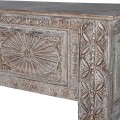 Luxusný starožitný konzolový stolík obdĺžnikového tvaru je vyrobený z dreva a zdobený precíznymi ornamentálnymi vyrezávaniami s kvetinovými a geometrickými motívmi, ktoré podčiarkujú jeho historický charakter a remeselnú hodnotu. Povrchová úprava v hnedo-sivom odtieni s patinou zvýrazňuje známky starnutia, čím vytvára autentický vintage vzhľad. Jeho rustikálny štýl ho predurčuje na použitie v tradičných interiéroch, kde vynikne ako elegantný a praktický doplnok. Ideálne sa hodí do obývačky, jedálne alebo predsiene, kde poslúži ako dekoratívny prvok na vystavenie váz, lámp či umeleckých predmetov. Skvelo sa kombinuje s prírodnými materiálmi, ako je ľan, bavlna alebo masívne drevo, čím pridáva priestoru útulnú a sofistikovanú atmosféru.
