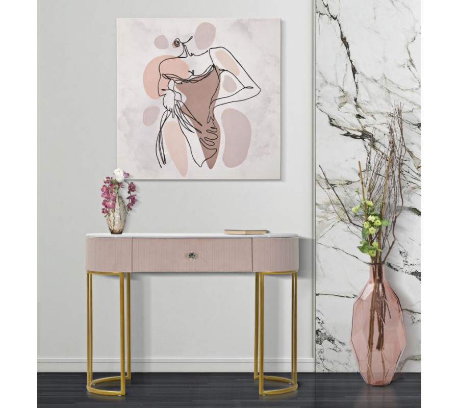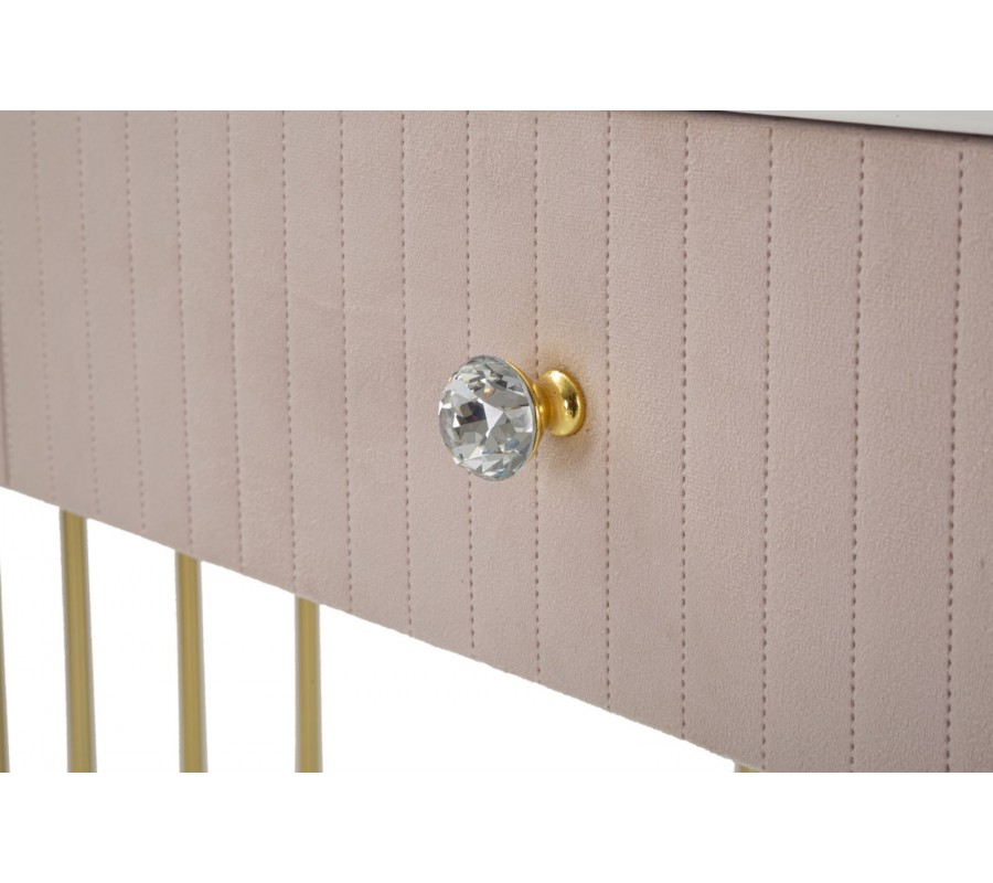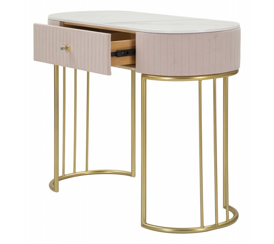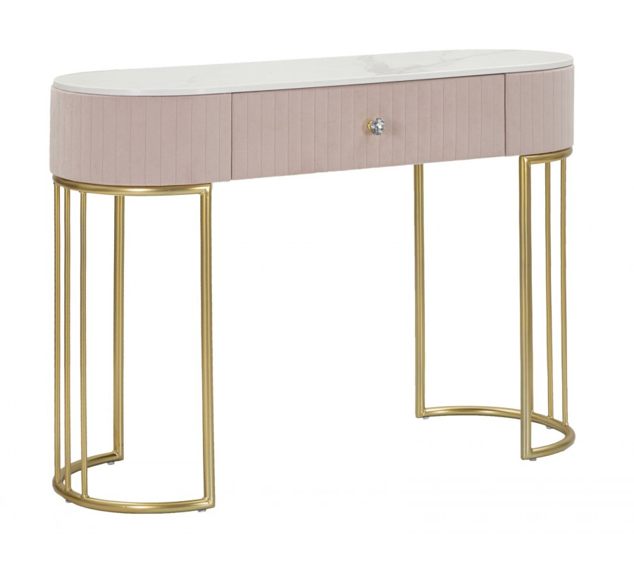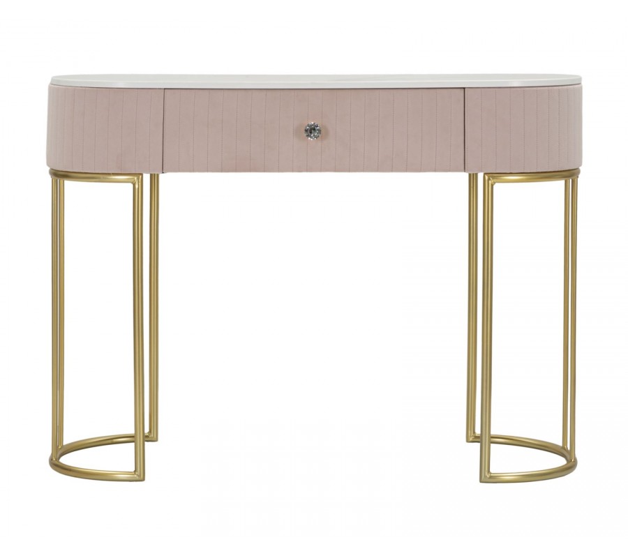 Luxusný glamour oválny konzolový stolík Glamia Tapisé so zásuvkou a svetlým ružovým poťahom so zlatou podstavou 100 cm