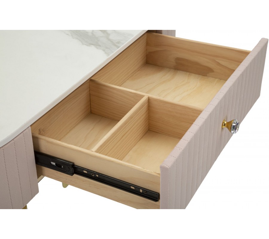 Obvod stolíka je potiahnutý ružovou zamatovou textíliou s ozdobným vertikálnym prešívaním. Svetlý púdrový odtieň výborne korešponduje s luxusným mramorovým vizuálom vrchnej dosky stolíka. Na bielom pozadí sa odvíja subtílna sivá kresba kameňa.