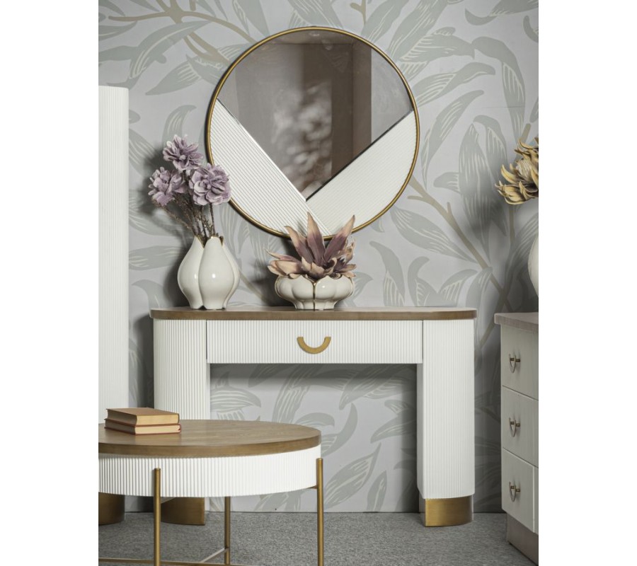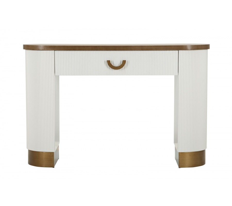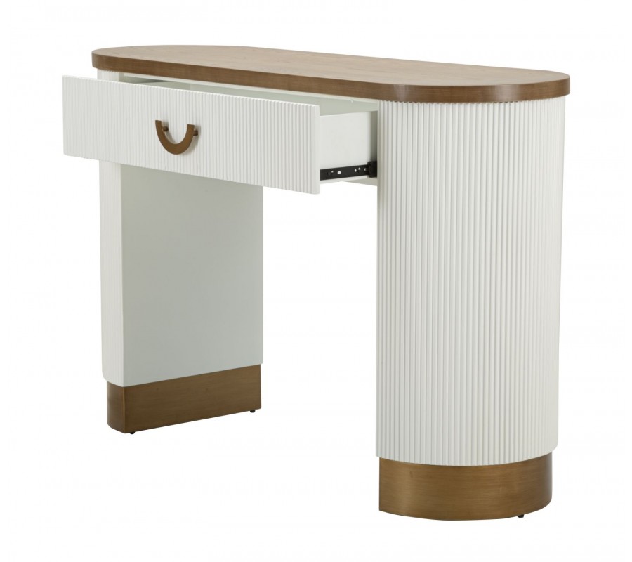 Art deco biely oválny konzolový stolík Glamia Blanc s vrúbkovaným dizajnom s hnedou drevenou doskou a zásuvkou 121 cm