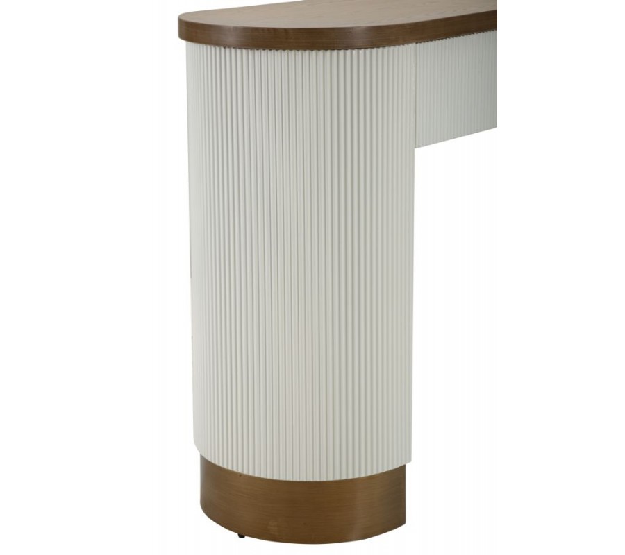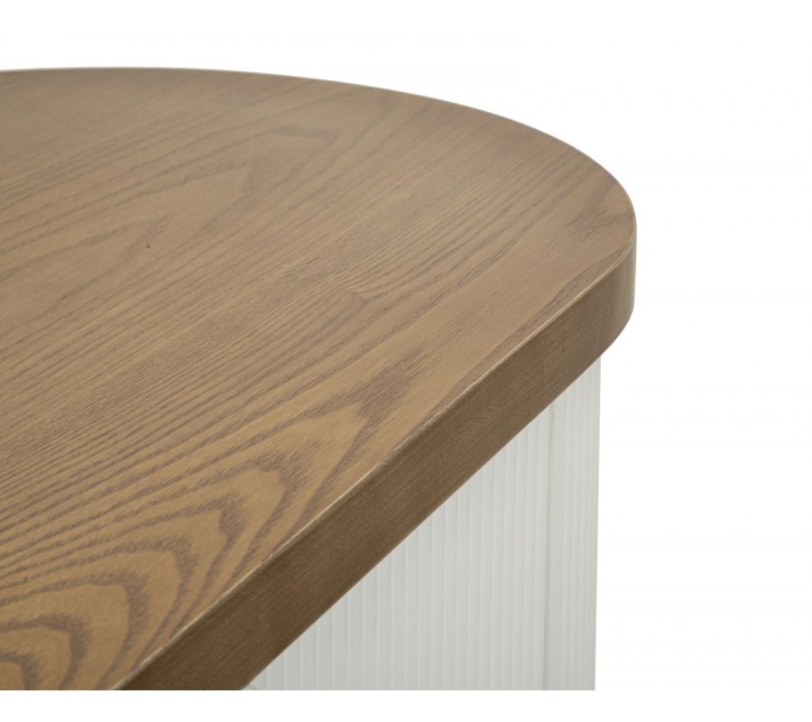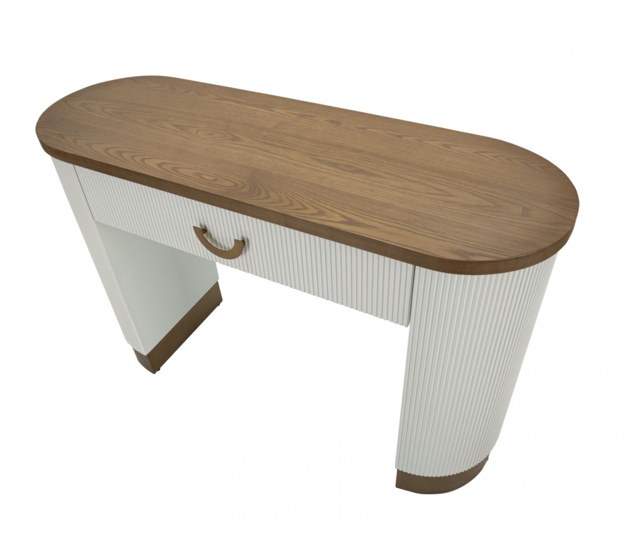 Konzolový stolík Glamia Blanc v oválnom tvare vyniká sofistikovaným spojením art deco a glamour štýlu. Jeho povrch je v bielej farbe so zaujímavou štruktúrou pozostávajúcou z jemných vertikálnych línií, ktoré dodávajú elegantný a moderný vzhľad. Vrchná doska je z jaseňového dreva v hnedých tónoch, s prirodzenou drevenou štruktúrou a jemne zaoblenými rohmi, čo zdôrazňuje jemnosť a ladnosť celkového dizajnu.