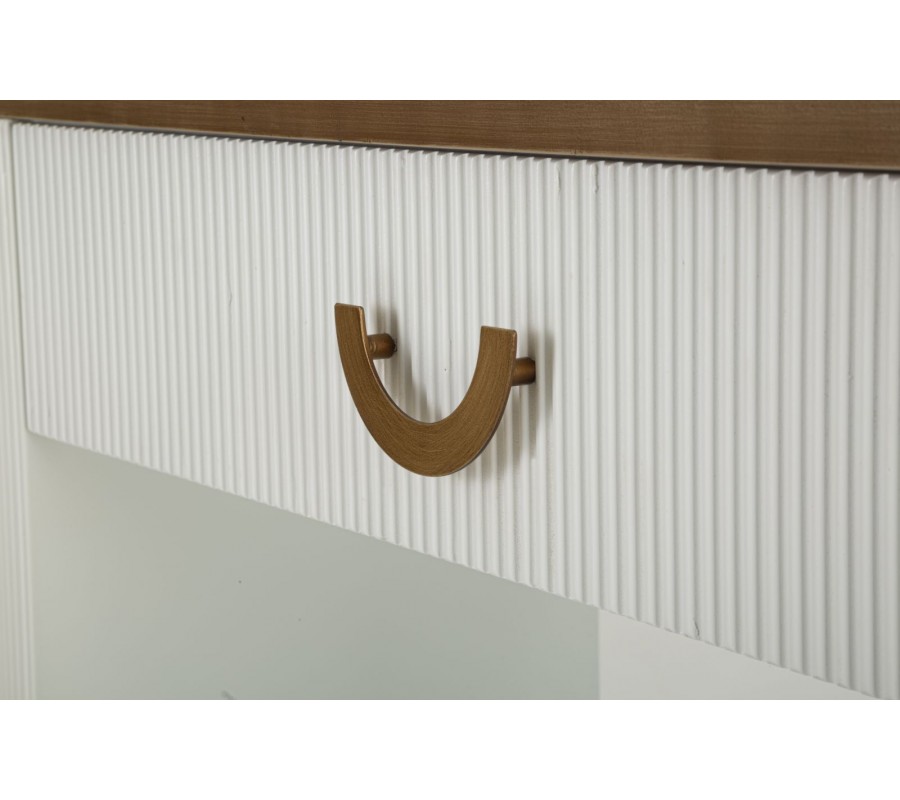 Nožičky stolíka sú laminátové, pričom ich spodná časť je ukončená kovovými podstavami v zlatej až bronzovej farbe, ktoré dodávajú luxusný nádych. Zásuvka má praktickú a estetickú úchytku v tvare polkruhu, ktorá je tiež vo farbe zlatej až bronzovej, čo perfektne ladí s ostatnými detailmi stolíka.