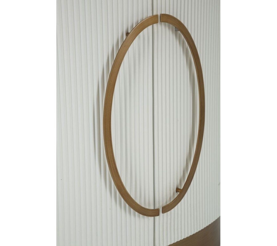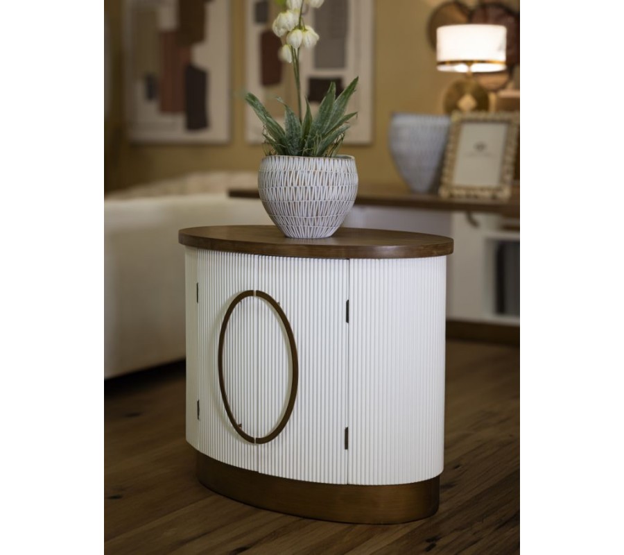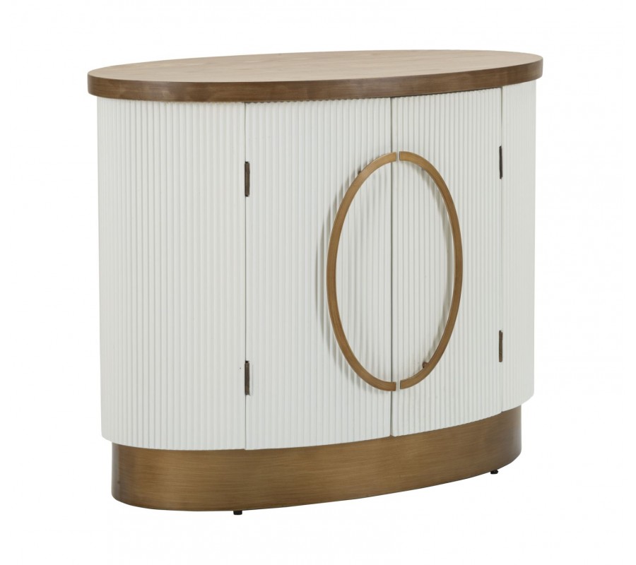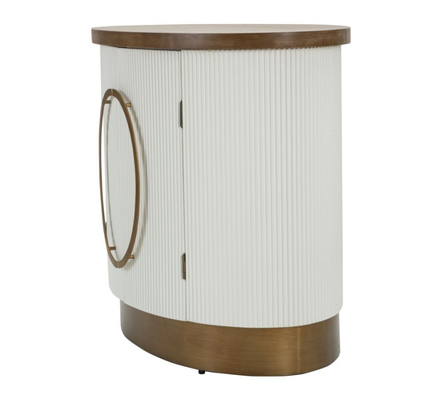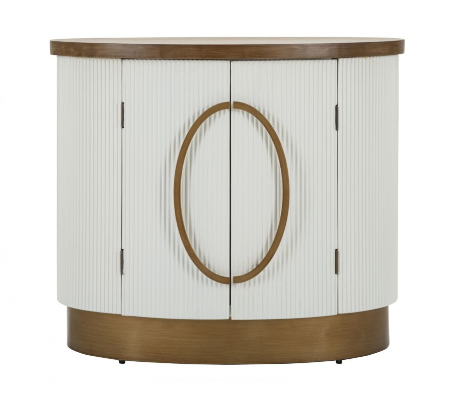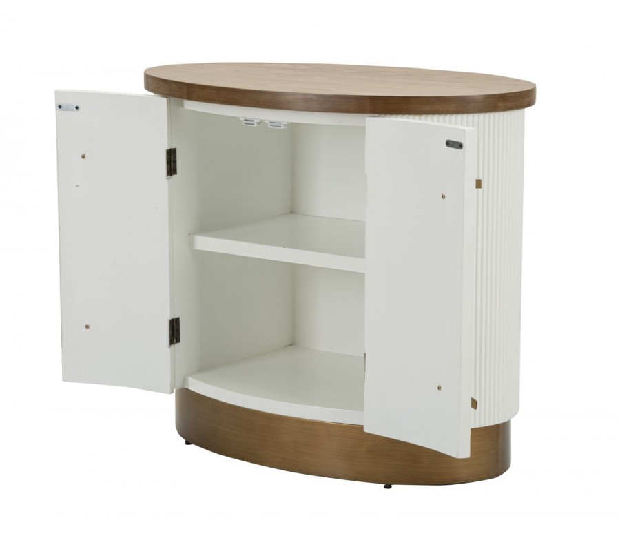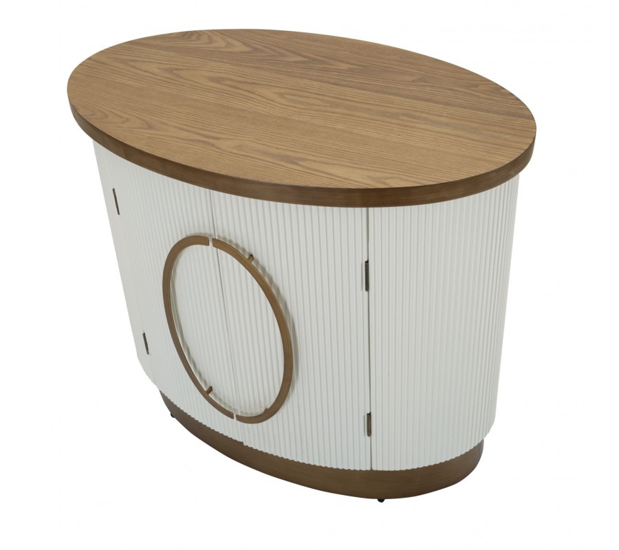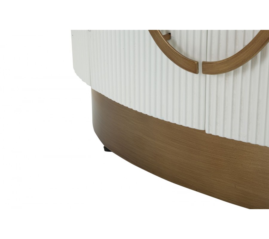 Art deco dvojdvierkový oválny konzolový stolík Glamia Blanc s hnedou drevenou doskou a vrúbkovaným krémovým korpusom 79 cm