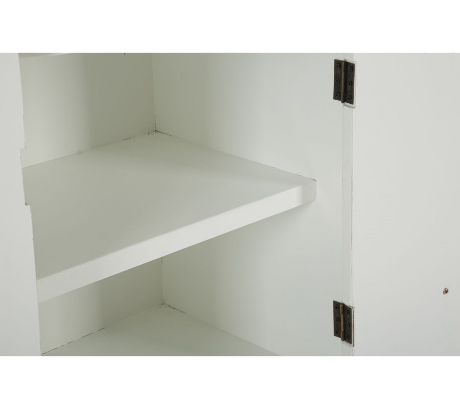 Vpredu sa nachádzajú dvoje dvierka, za ktorými je jedna polička rozdeľujúca vnútorný priestor. Dvierka majú výrazné okrúhle kovové úchytky v zlato bronzovom tóne, ktoré ladia s kovovou podstavou stolíka. Tá obopína spodnú časť nábytku a dodáva mu stabilitu a luxusný vzhľad.