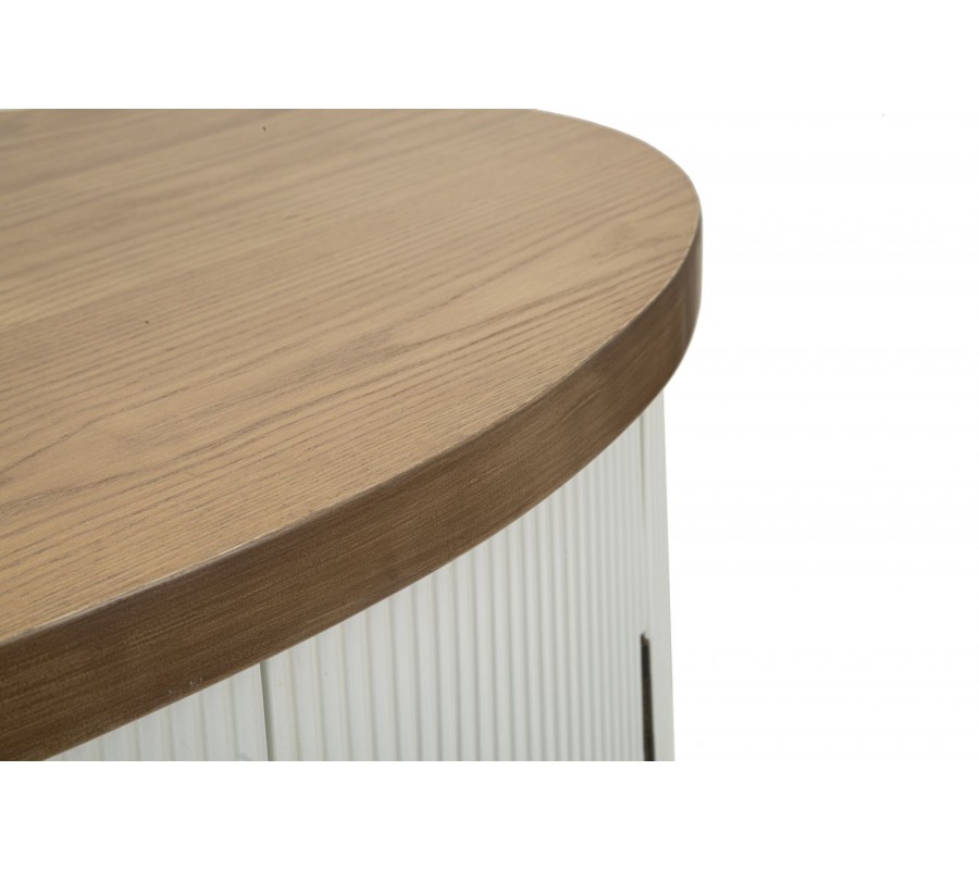 Konzolový stolík Glamia Blanc má pôsobivý, oválny tvar s jemne zaoblenými rohmi. Korpus je vyrobený z laminátu s vrúbkovanou povrchovou úpravou v krémovom odtieni, čo mu dodáva elegantnú plastickú štruktúru. V hornej časti je doska z jaseňového dreva, ktorá má prirodzene hnedú teplú farbu s jemne viditeľnou kresbou. Povrch je hladko upravený, vďaka čomu príjemne kontrastuje s vrúbkovanými bokmi stolíka.