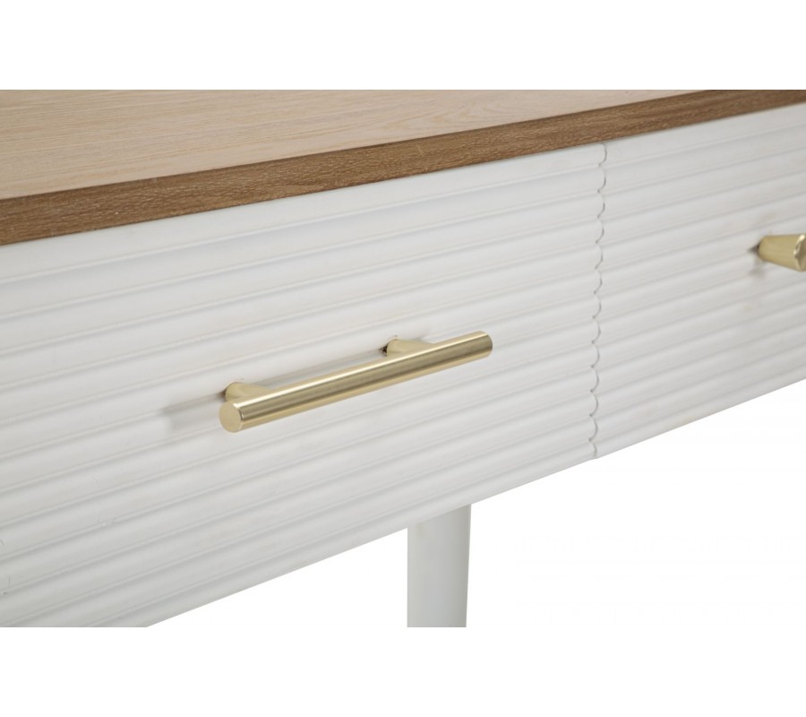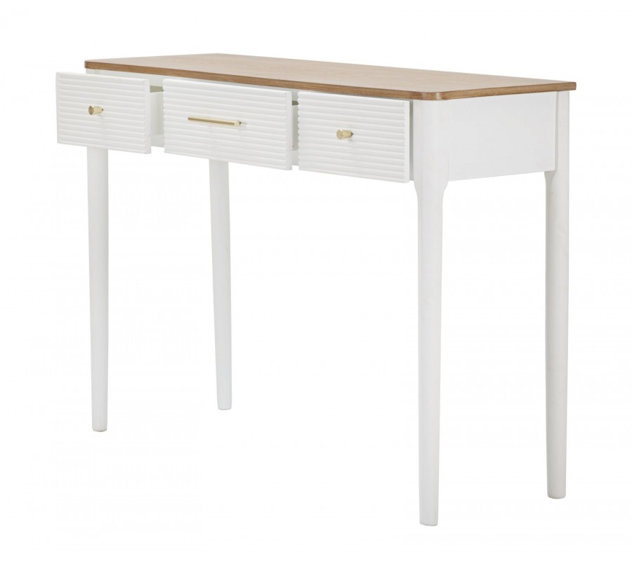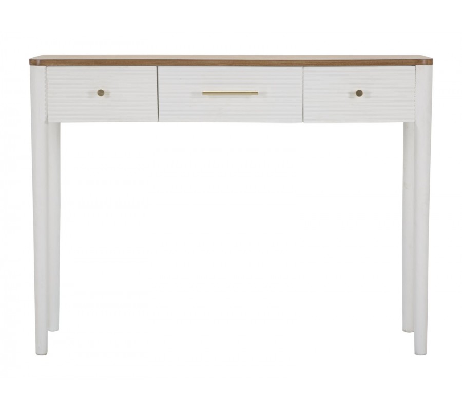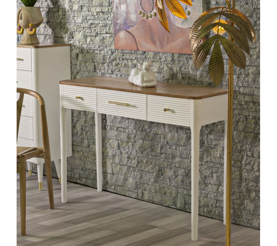 Art deco obdĺžnikový drevený konzolový stolík Samira s tromi zásuvkami v bielej farbe a hnedou vrchnou doskou 107 cm
