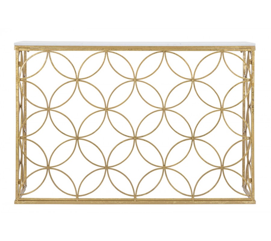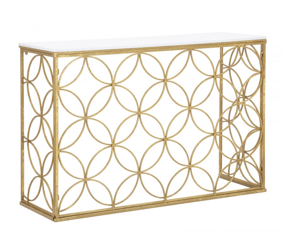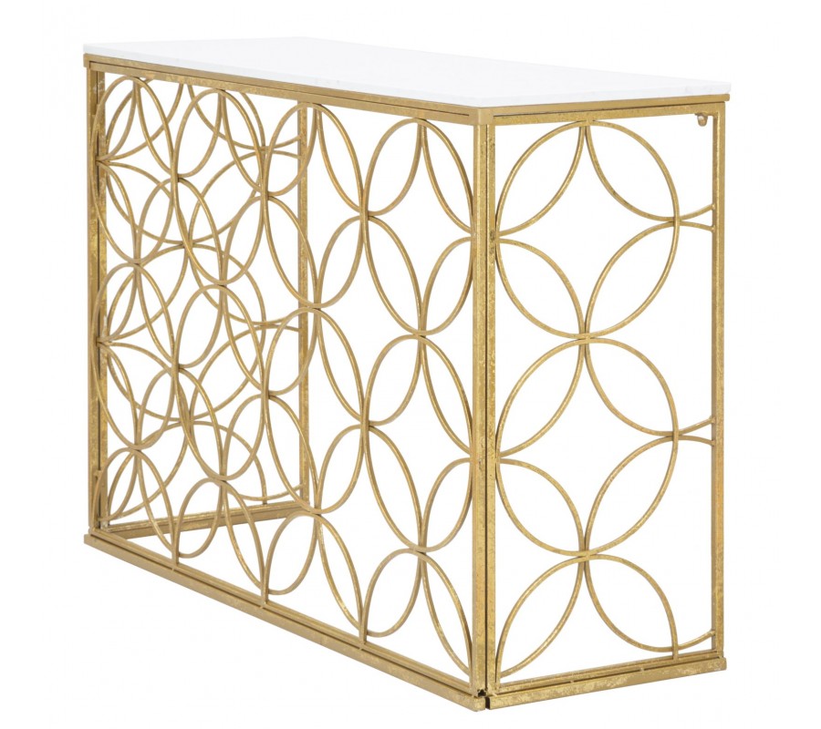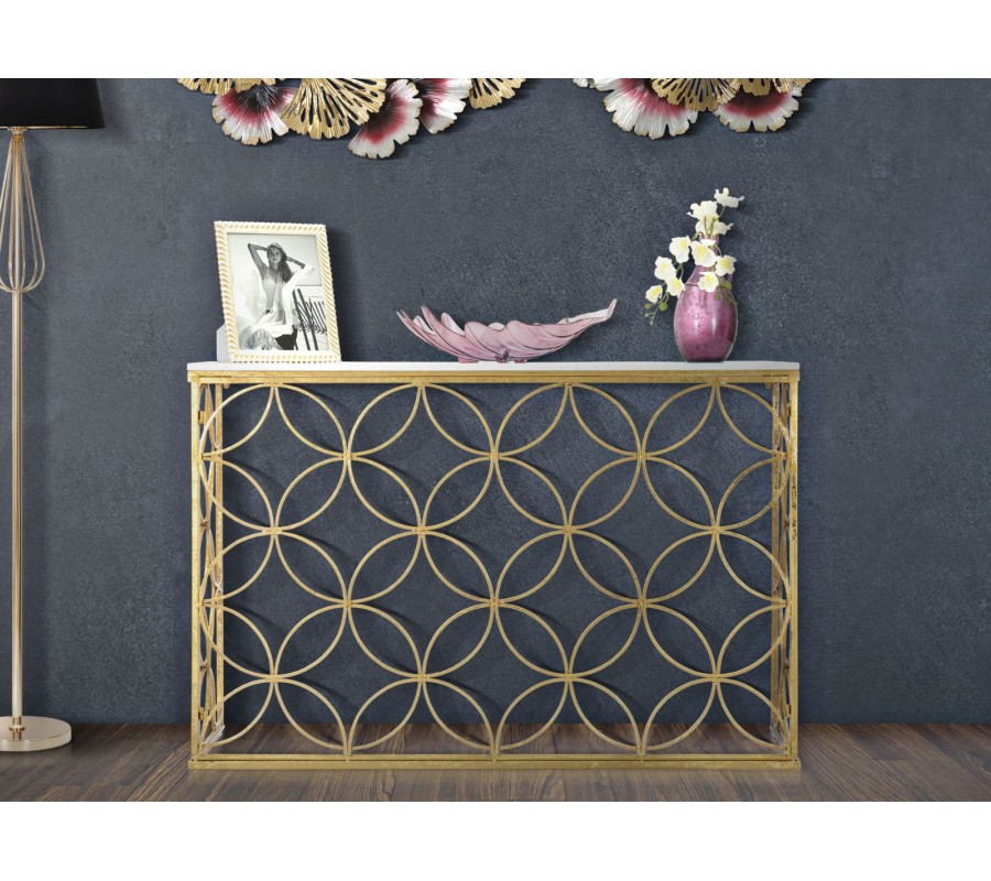 Dizajnový art deco konzolový stolík Fiona so zlatou podstavou s geometrickým vzorom kvetov a bielou mramorovou doskou 120 cm