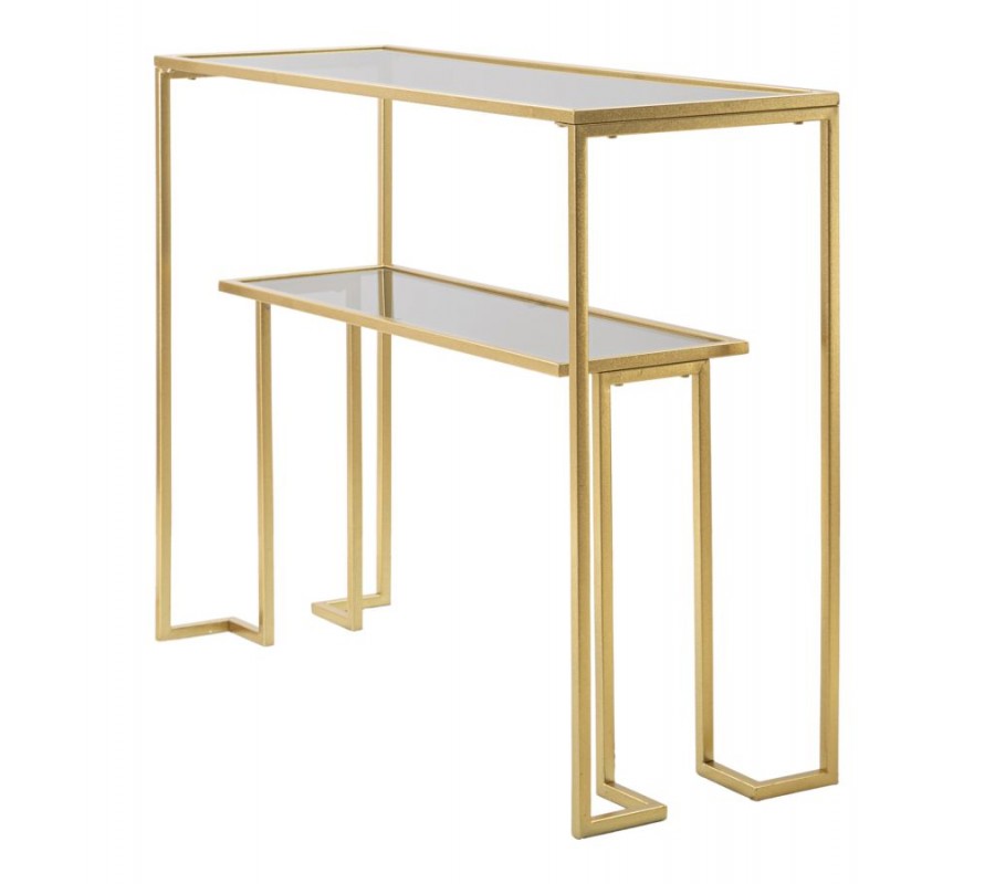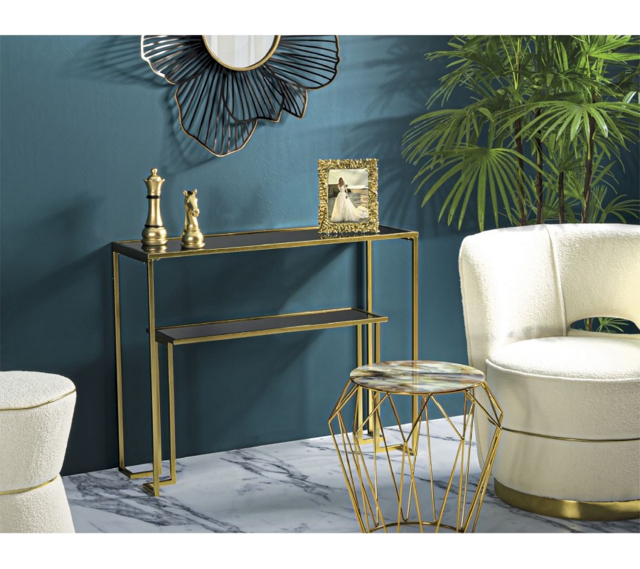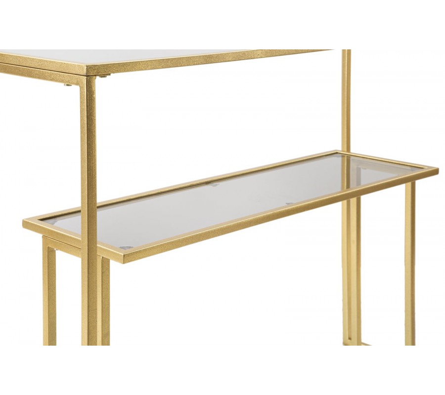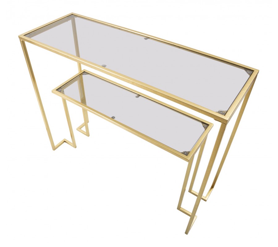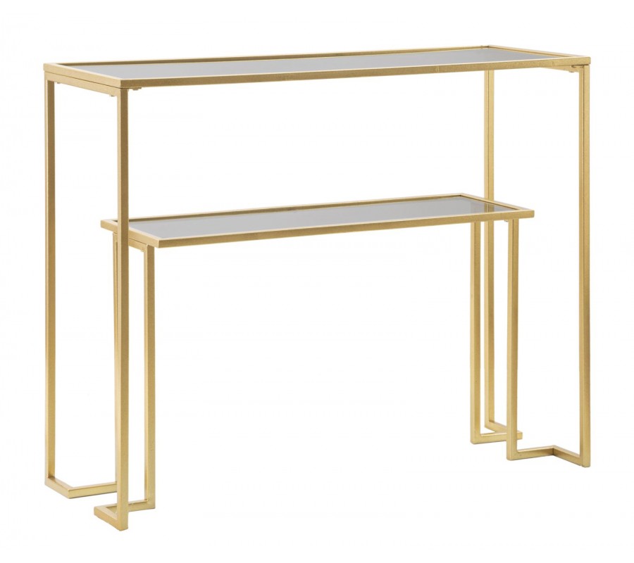 Dizajnový art deco konzolový stolík Ornella so zlatou kovovou konštrukciou a dvomi sklenenými doskami 100 cm