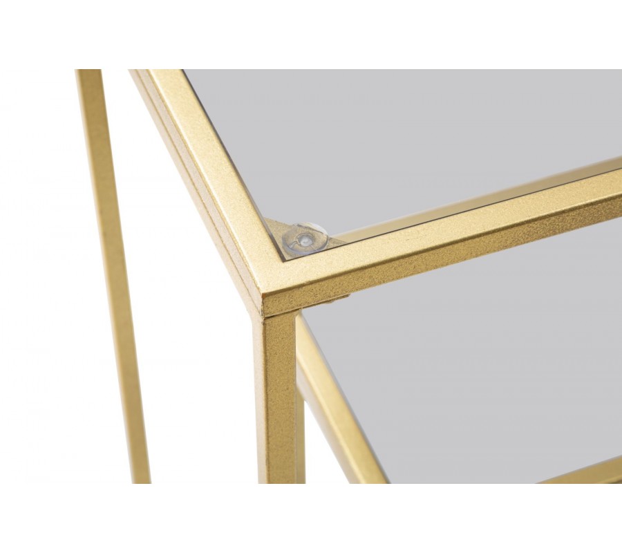 Vrchná doska aj polica majú výplne z bezpečnostného skla s elegantným dymovým tónovaním. Tmavšie sklo výborne korešponduje so žiarivou zlatou farbou konštrukcie.