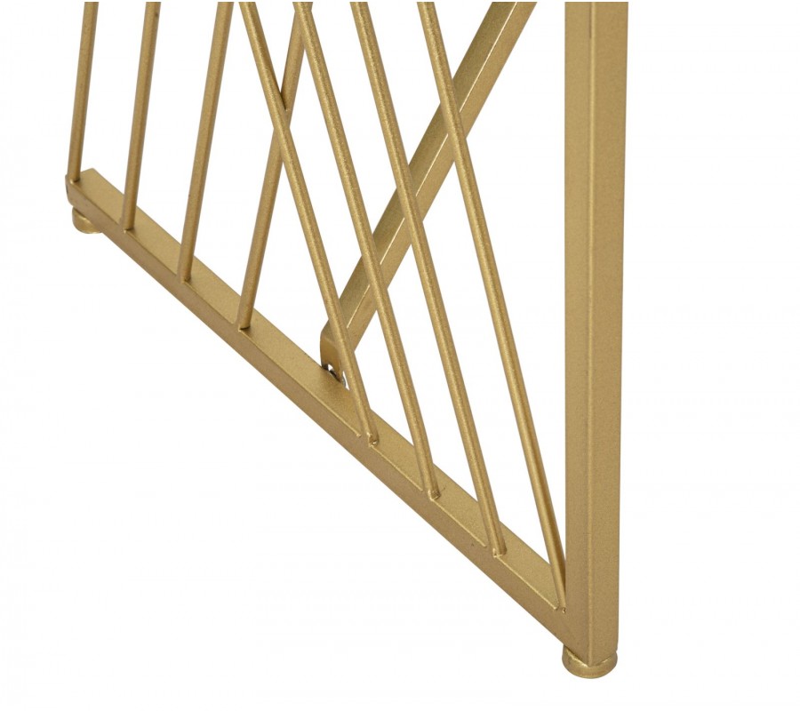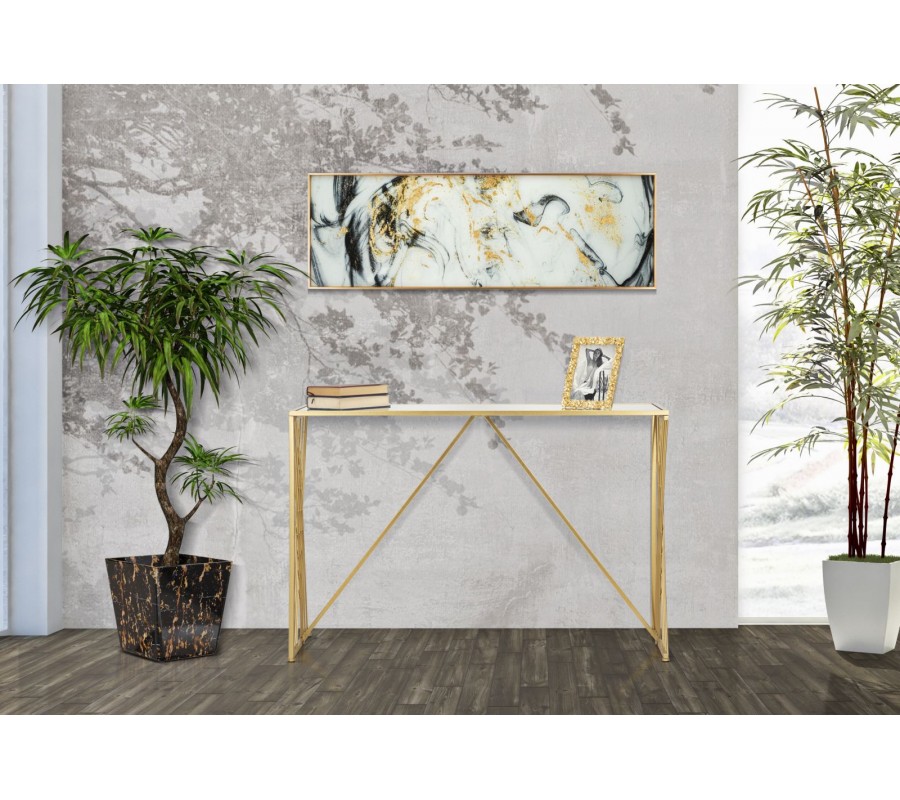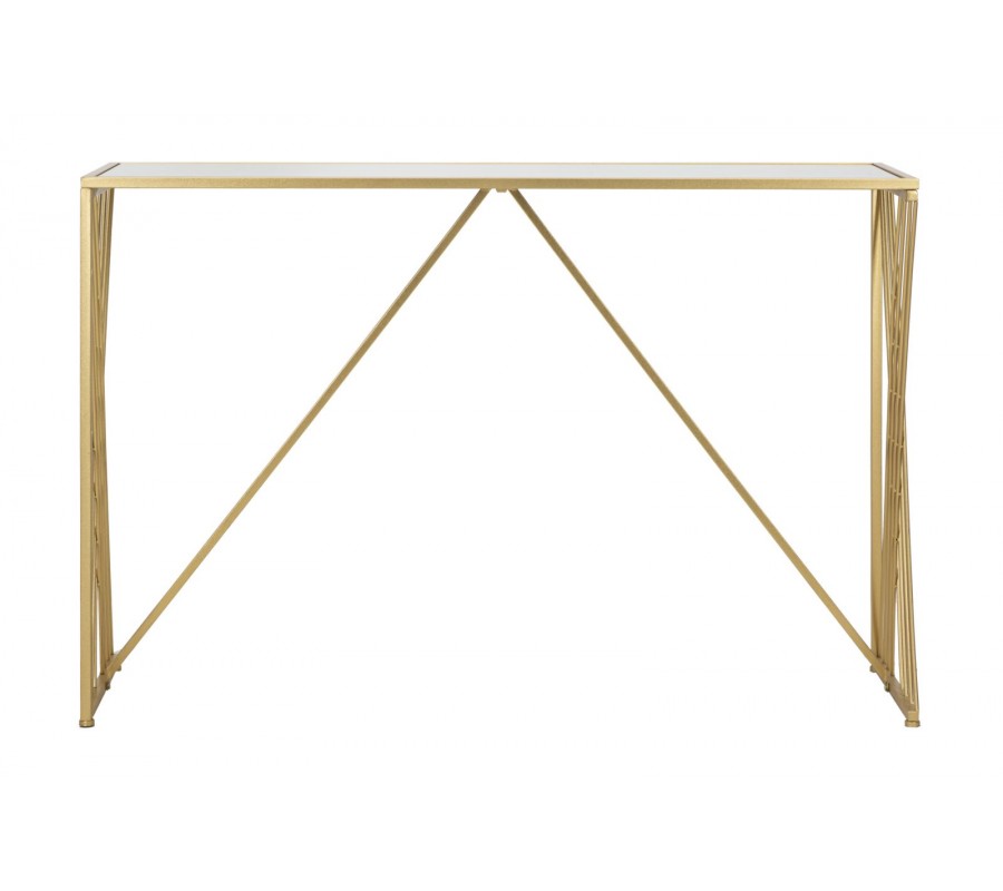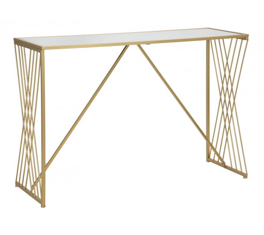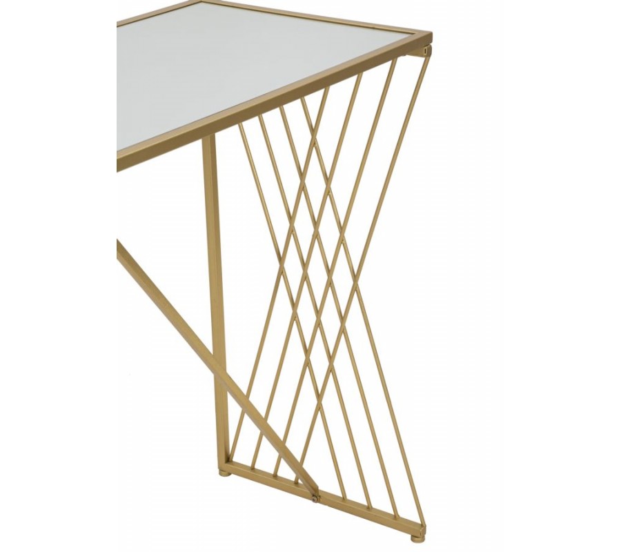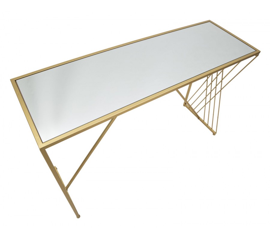 Dizajnový art deco konzolový stolík Mardella so zrkadlovou doskou a kovovou konštrukciou v zlatej farbe 129 cm