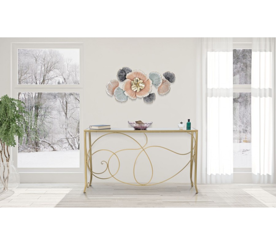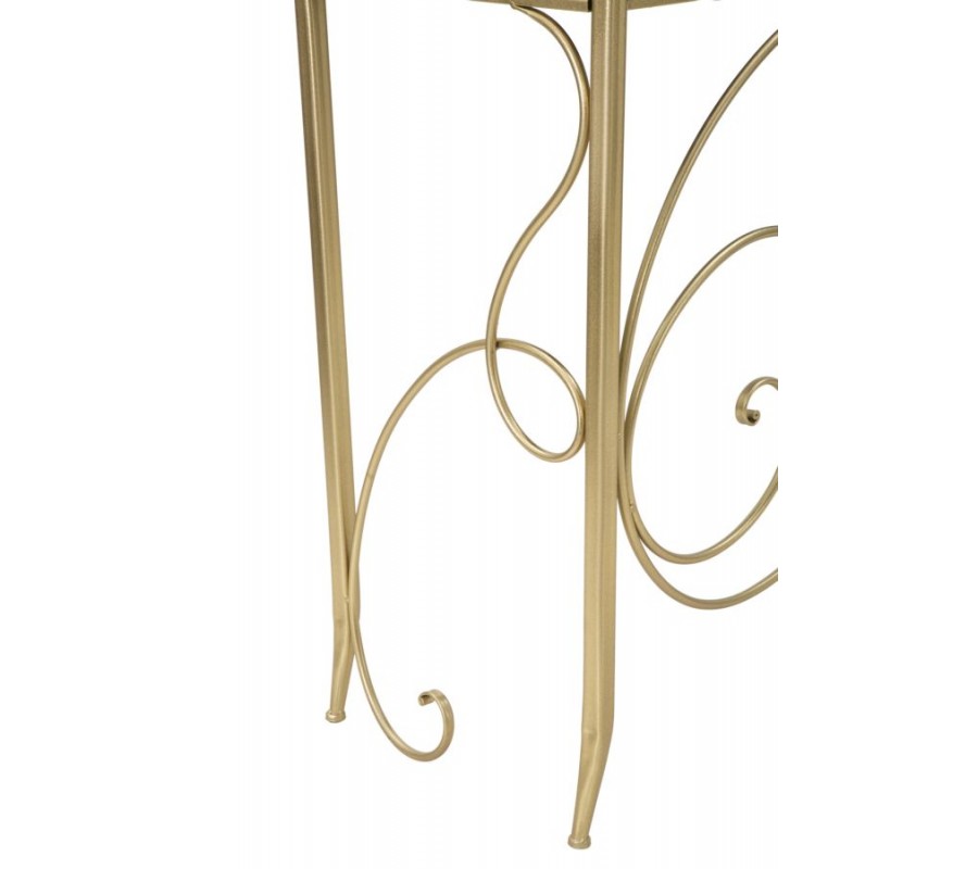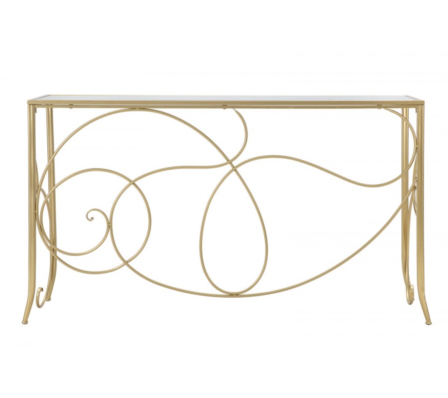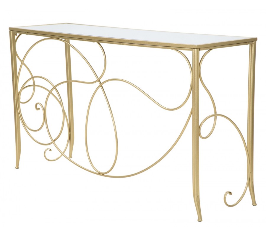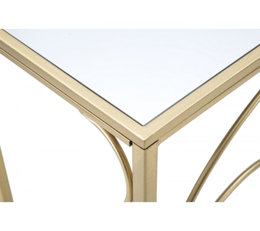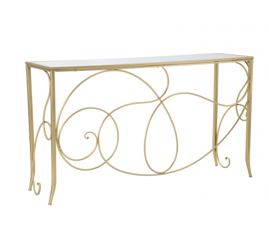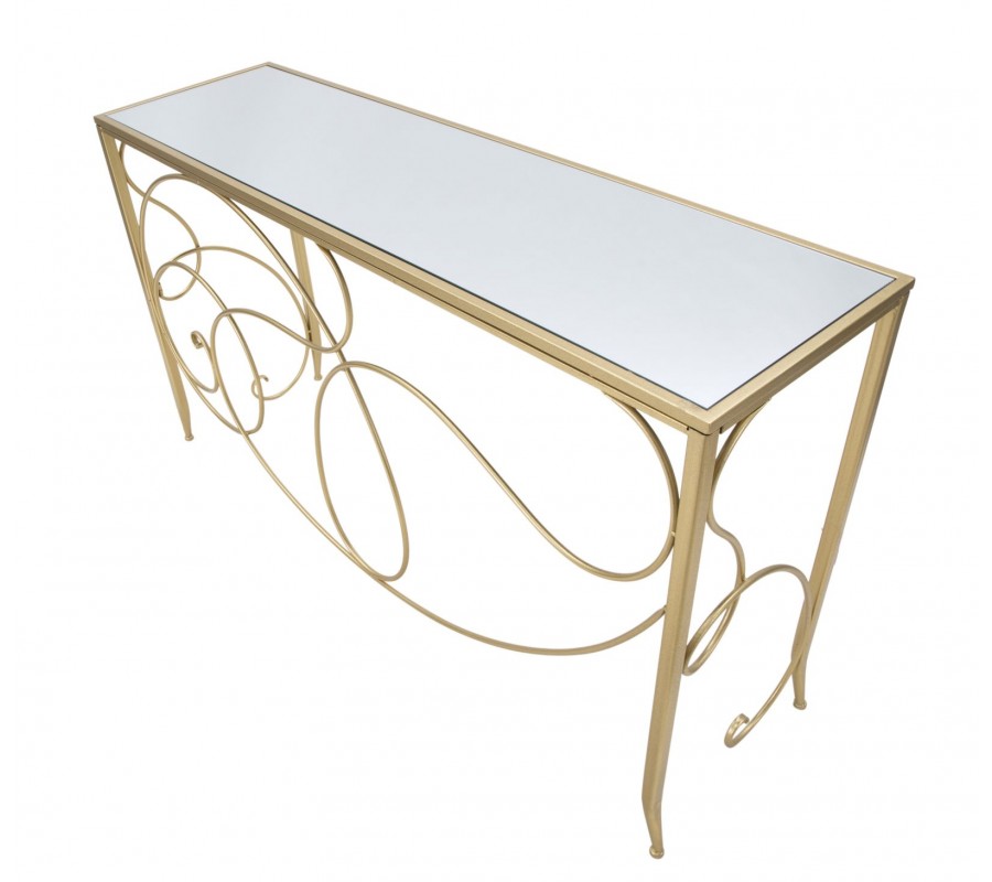 Konzolový stolík má obdĺžnikovú vrchnú dosku, vyrobenú z pevnej MDF dyhy, prekrytú zrkadlovým sklom. Je umiestnená v tenkom kovovom ráme, ktorý sa pripája k podstave. Žiarivo zlaté prevedenie výborne dopĺňa reflexný povrch a pomôže vám pomocou odrazov svetla priestor rozžiariť.