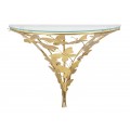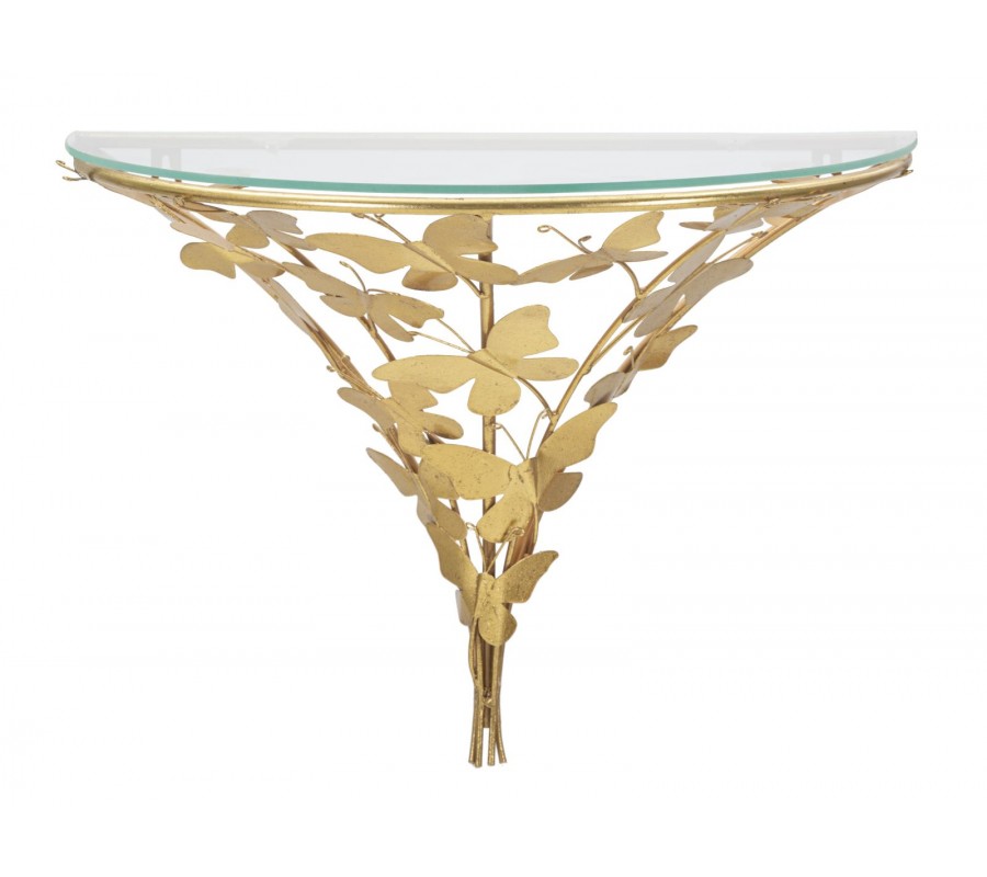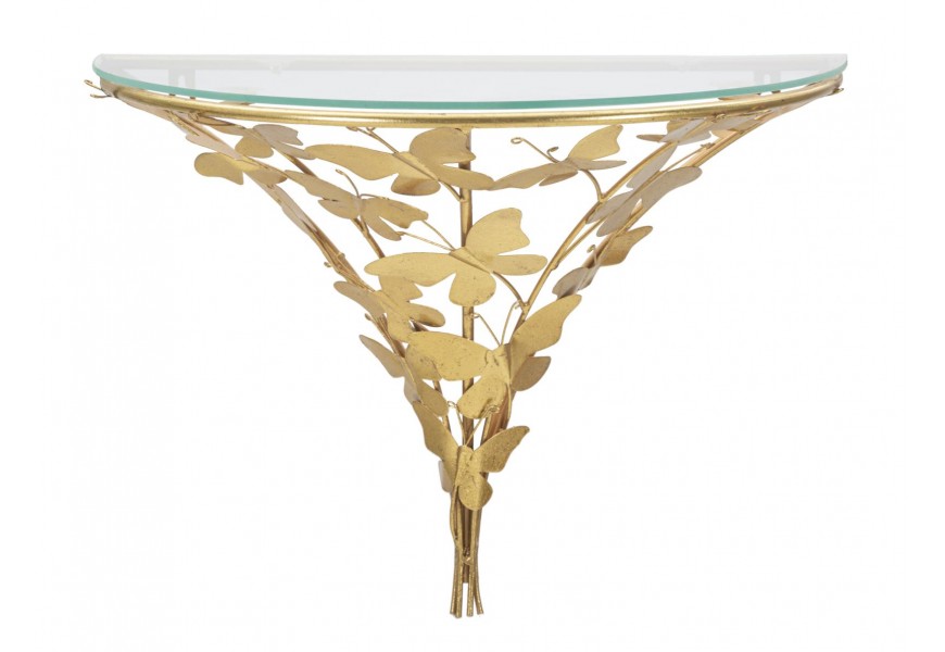Sklenený glamour konzolový stolík Papillon polkruhového tvaru s podstavou s dizajnom motýľov v zlatej farbe 45 cm