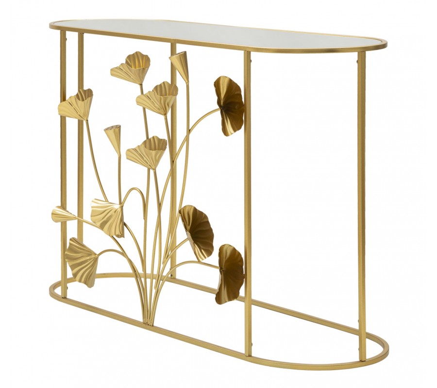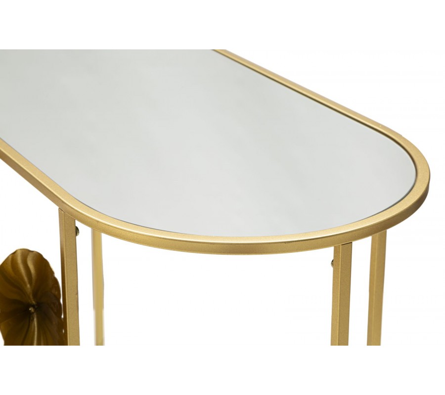 Dizajnový glamour zlatý konzolový stolík Natura Elegante s florálnym zdobením a oválnou zrkadlovou vrchnou doskou 120 cm