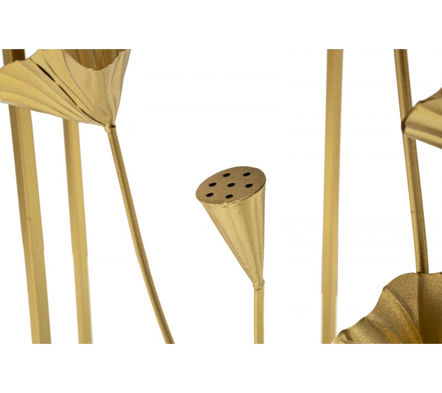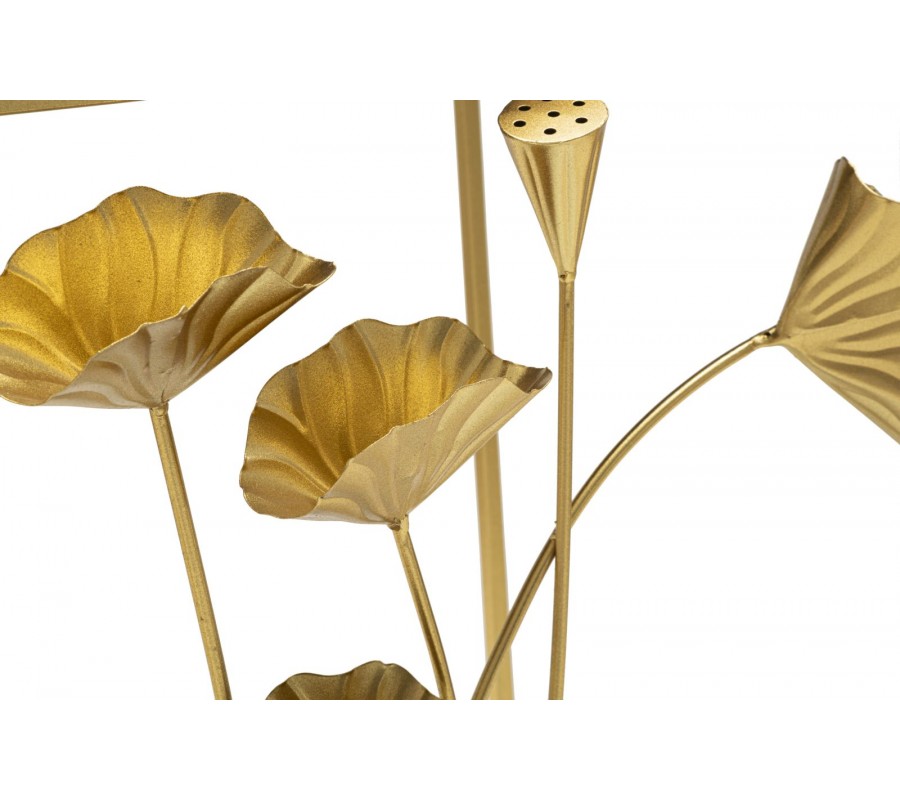 Podstava má lesklé zlaté prevedenie, ktoré pôsobí luxusný dojmom. V spodnej časti sa nachádza oválny rám, ktorý je prepojený s vrchnou doskou šiestimi tenkými nožičkami, umiestnenými na kratších stranách. Prednú stranu vypĺňa delikátny dizajn, zachytávajúci makové kvety a makovice na dlhých elegantných zvlnených stonkách. Detailne prepracované okvetné lístky pôsobia dynamickým dojmom, akoby sa rastlina pokojne vlnila vo vetre.
