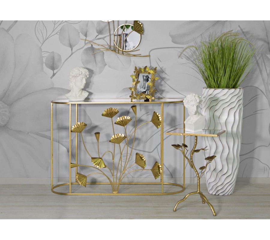 Konzolový stolík Natura Elegantne bude neprehliadnuteľným doplnkom vašej predsiene či jedálne. Delikátne zdobenie mu dodáva pridanú estetickú hodnotu, zatiaľ čo zlatá farba prináša do dizajnu exkluzívny glamour nádych.