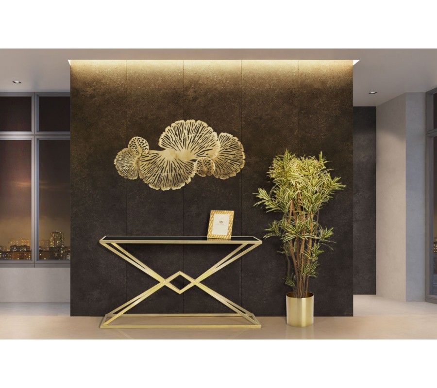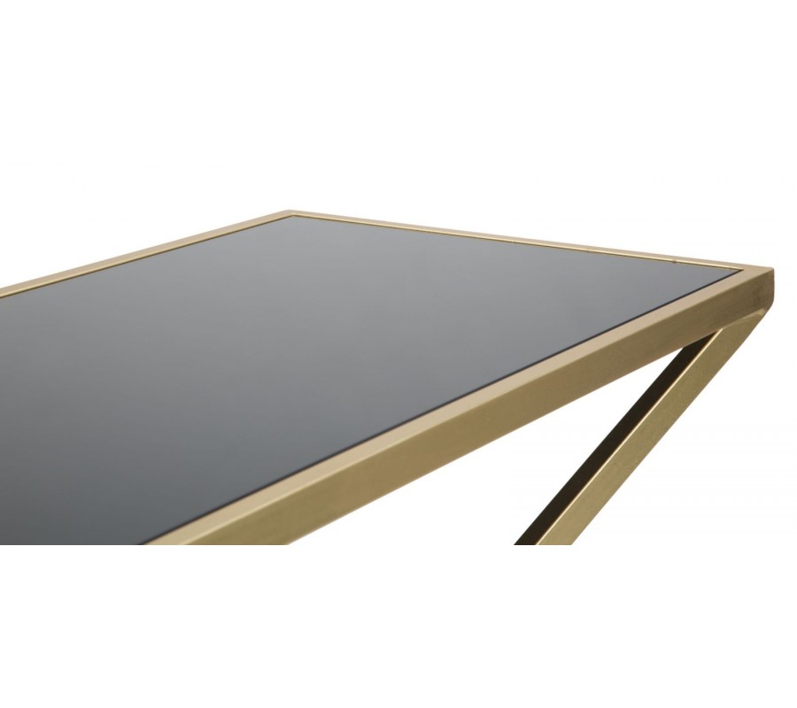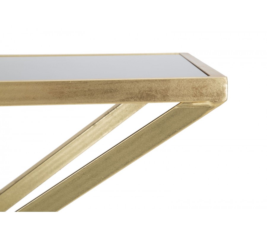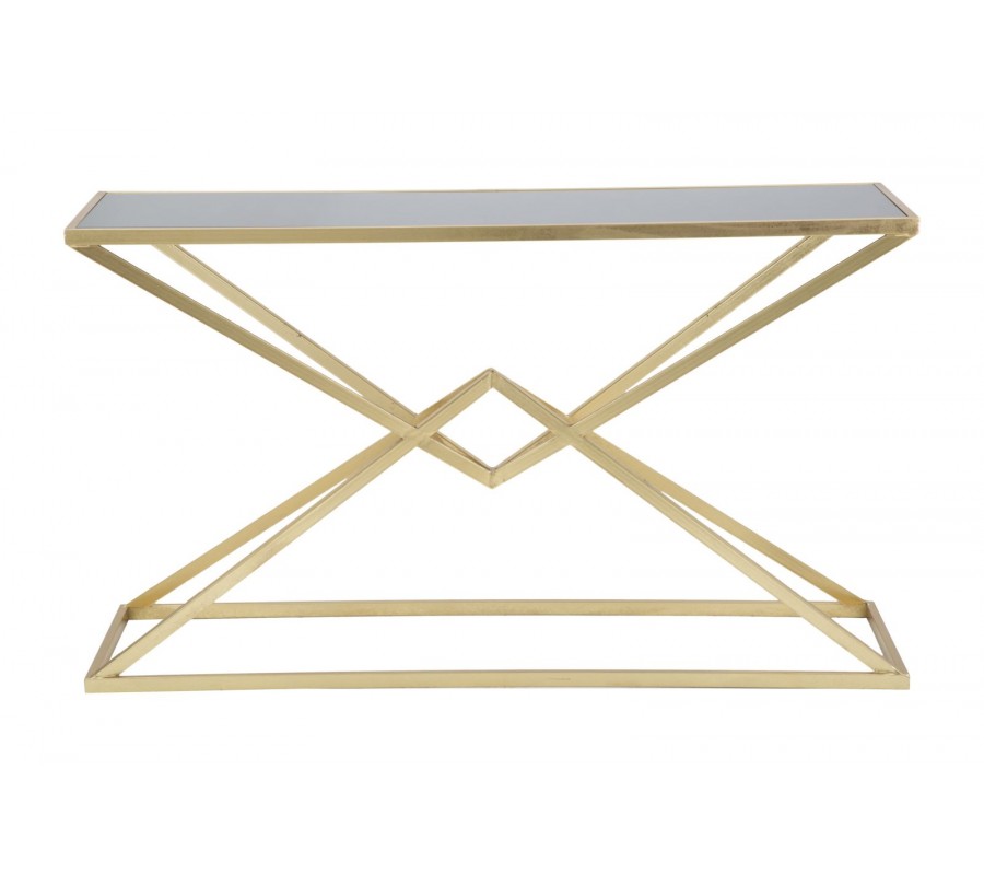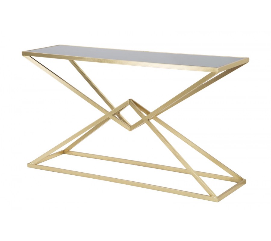 Konzolový stolík má obdĺžnikovú vrchnú dosku, vyrobenú z čierneho skla. Povrch je reflexný a výborne dopĺňa zlatú lesklú podstavu. Podstava je vyrobená z kovu a je dominantným prvkom dizajnu. Tvoria ju dva obdĺžnikové rámy, z ktorých vychádzajú štyri diagonálne línie, tvoriace pyramídový tvar. Ich vrcholy sa prelínajú a vzniká tak elegantná silueta presýpacích hodín.