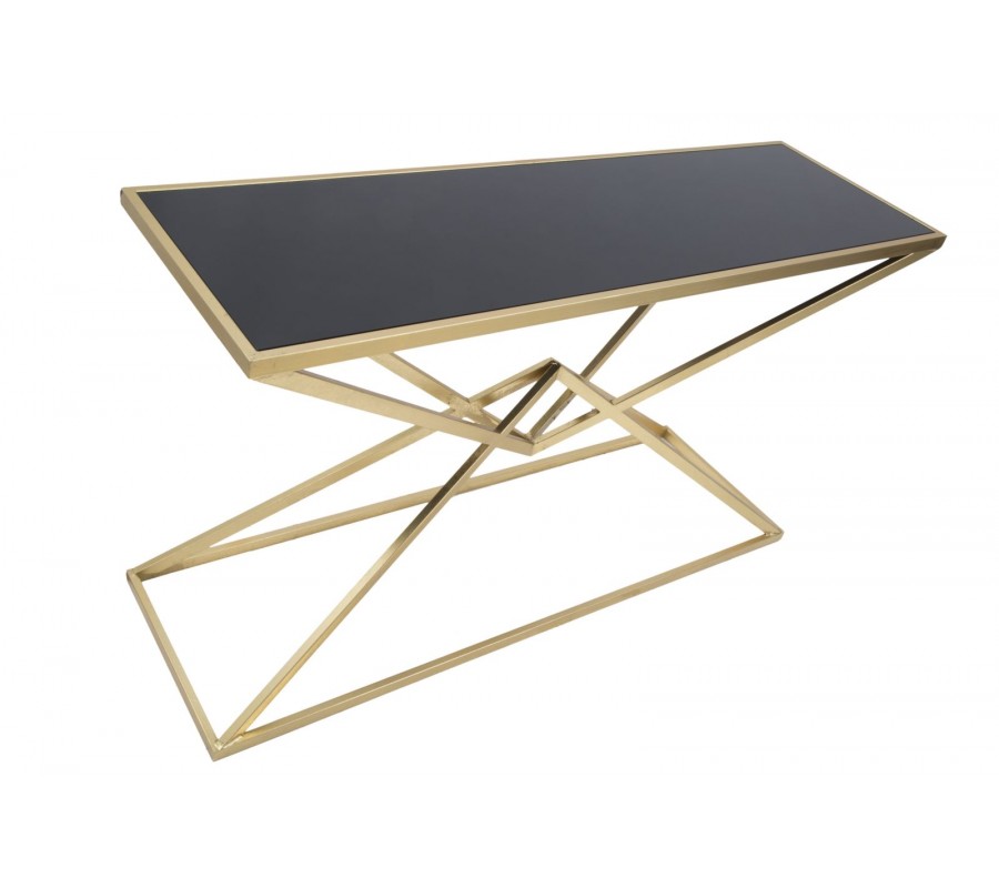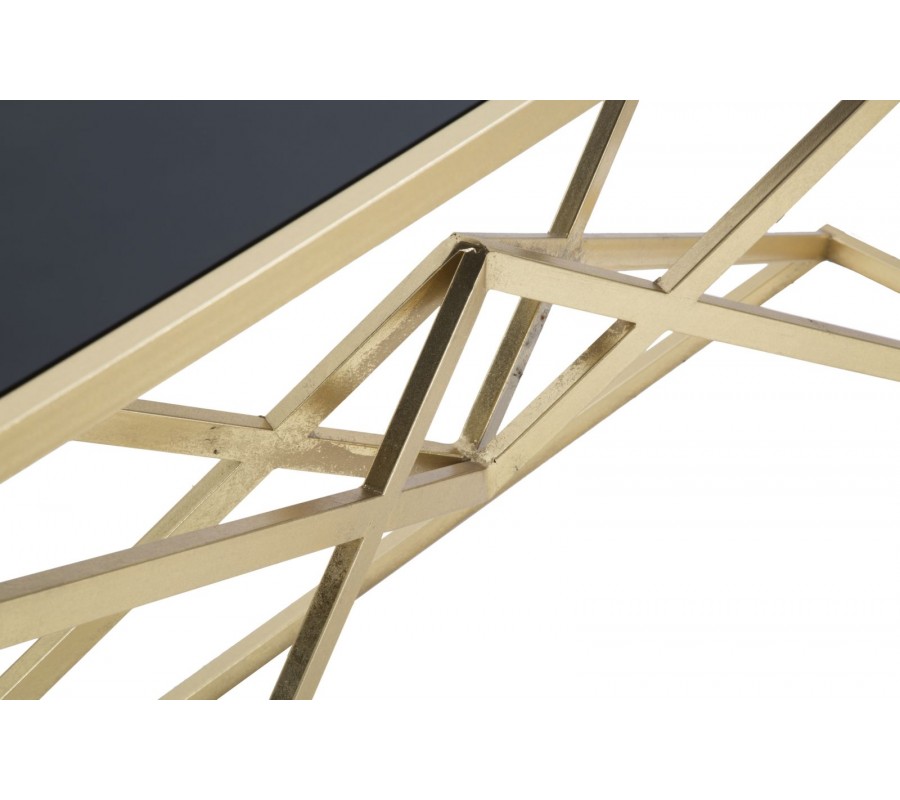 Dizajnový art deco konzolový stolík Triangolo Oro s obdĺžnikovou doskou z čierneho skla a geometrickou zlatou podstavou 130 cm