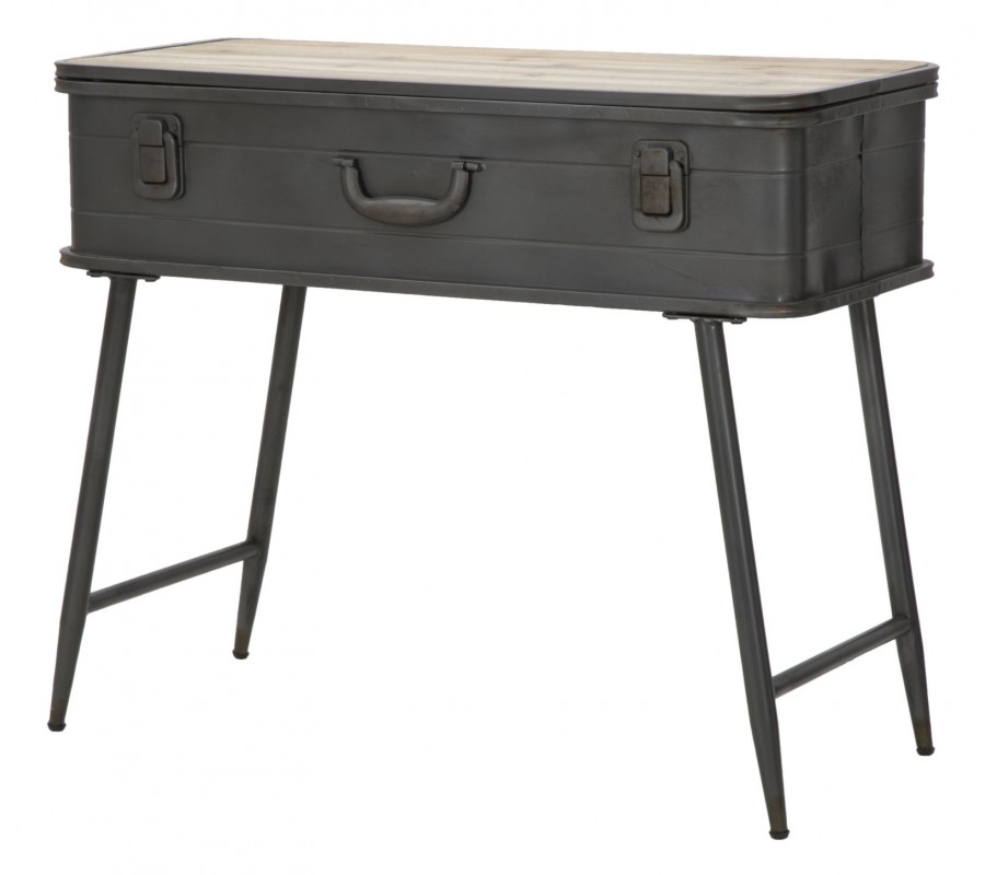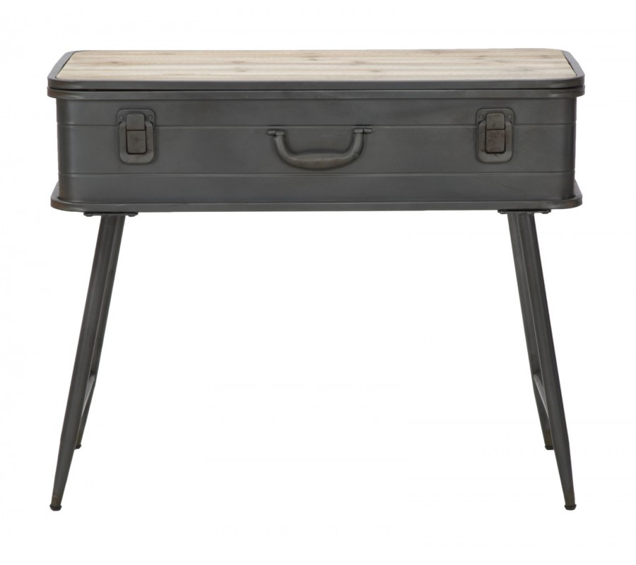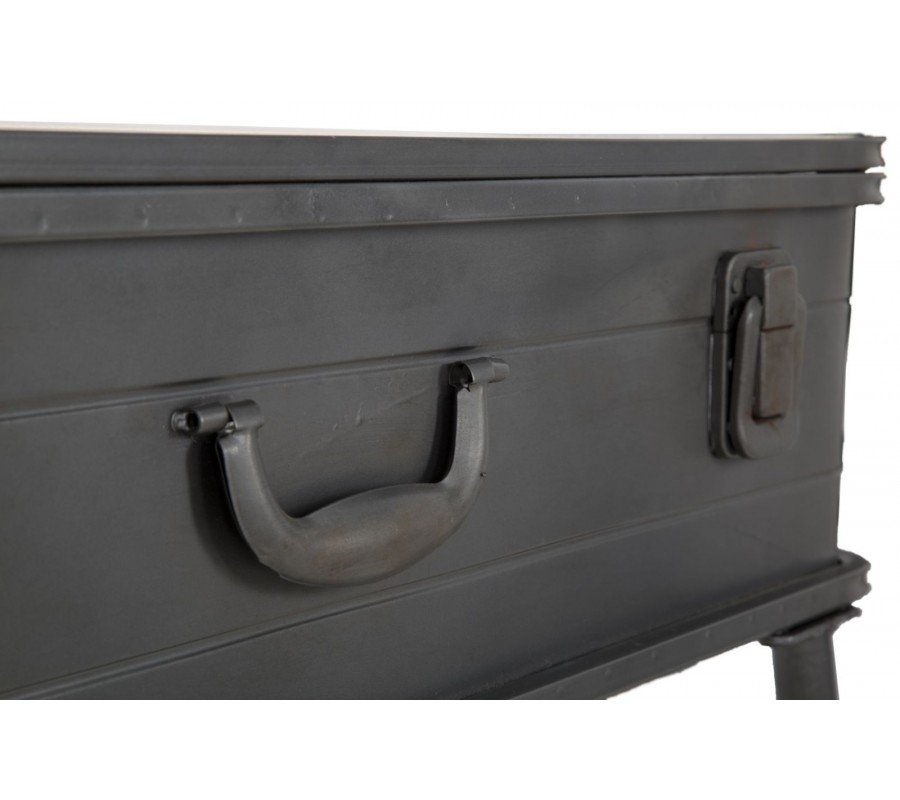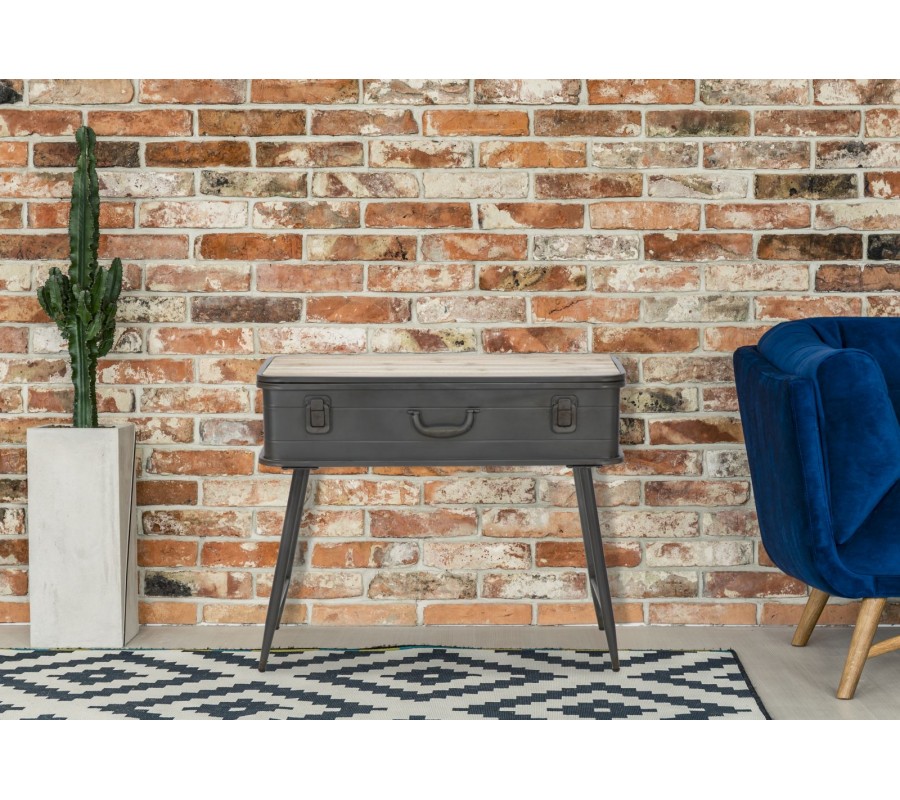 Konzolový stolík má obdĺžnikový tvar a jeho vrchná časť pripomína cestovnú truhlicu. Má zaoblené rohy, ktoré pôsobia pôsobia elegantným dojmom a zjemňujú industriálny dizajn. Konštrukcia stolíka je vyrobená z kovu v tmavej sivej farbe. Miestami zdobí povrch hnedá patina, ktorá dodáva nábytku originálny vintage vzhľad. Nožičky sú zošikmené a na kratších stranách spojené lineárnou spojnicou.