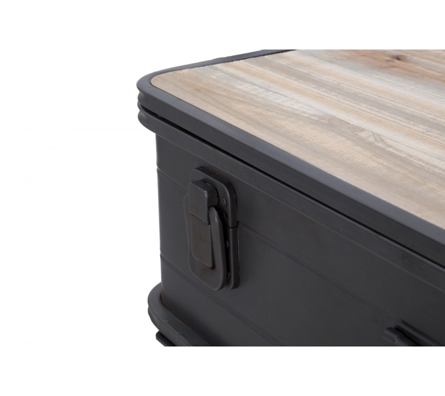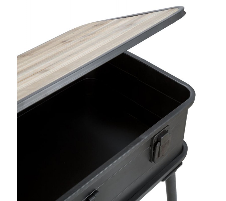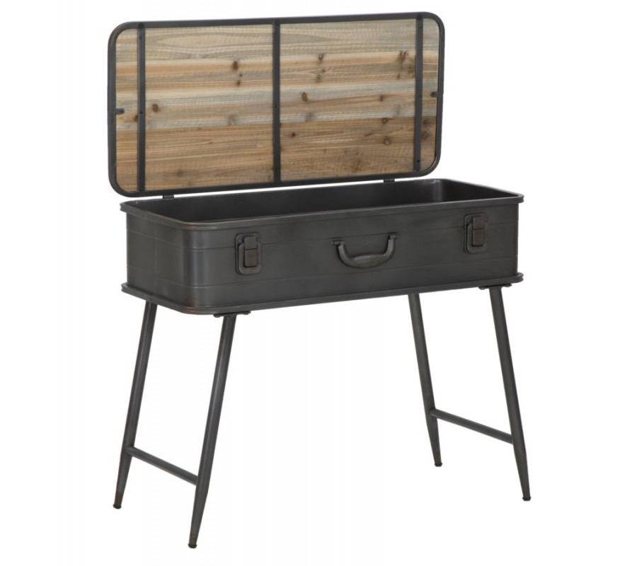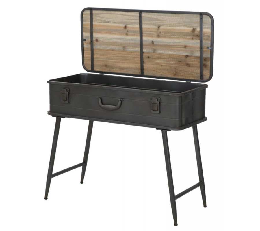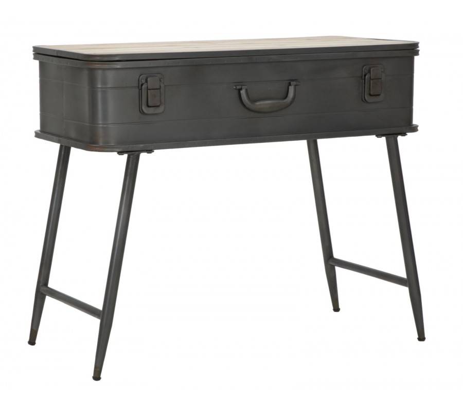 Konzolový stolík má obdĺžnikový tvar a jeho vrchná časť pripomína cestovnú truhlicu. Má zaoblené rohy, ktoré pôsobia pôsobia elegantným dojmom a zjemňujú industriálny dizajn. Konštrukcia stolíka je vyrobená z kovu v tmavej sivej farbe. Miestami zdobí povrch hnedá patina, ktorá dodáva nábytku originálny vintage vzhľad. Nožičky sú zošikmené a na kratších stranách spojené lineárnou spojnicou.