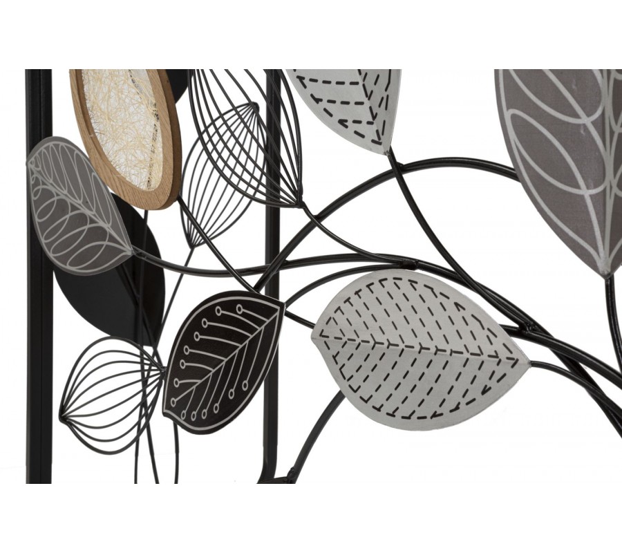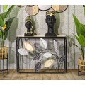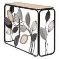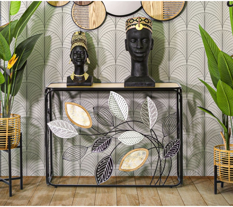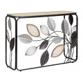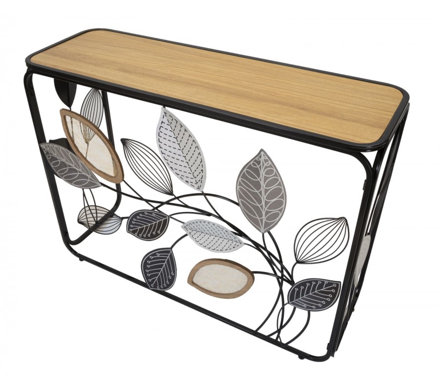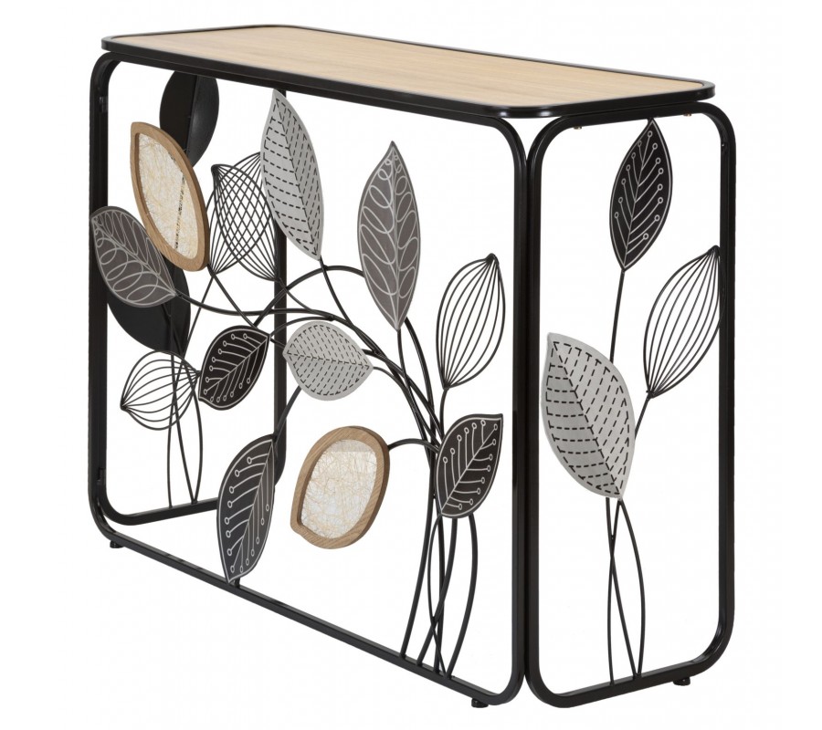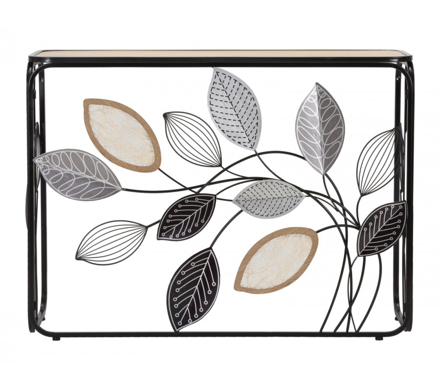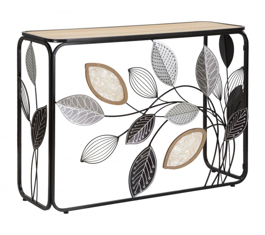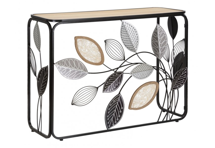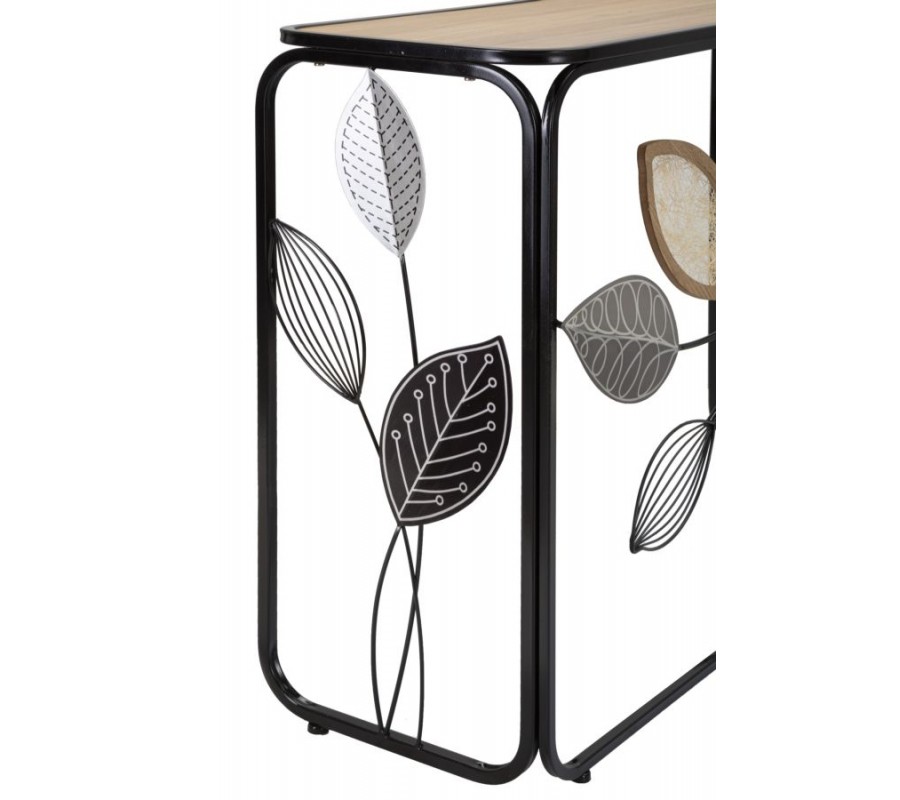 Konzolový stolík Florel prináša do interiéru jemnú estetiku prírody v kombinácii s moderným dizajnom. Čierna kovová konštrukcia je zdobená detailne spracovanými listovými vzormi, ktoré vytvárajú vzdušný a elegantný efekt. Motívy lístkov v čiernej, sivej a naturálnej hnedej farbe dodávajú stolíku sofistikovaný vzhľad a harmonicky sa spájajú s prírodným dreveným povrchom vrchnej dosky.