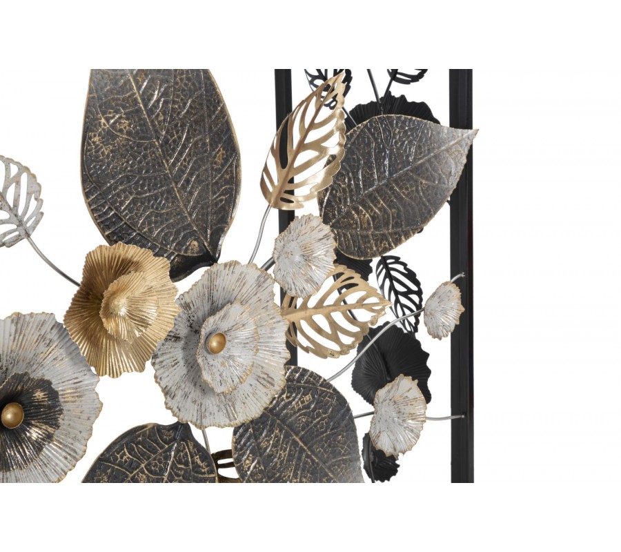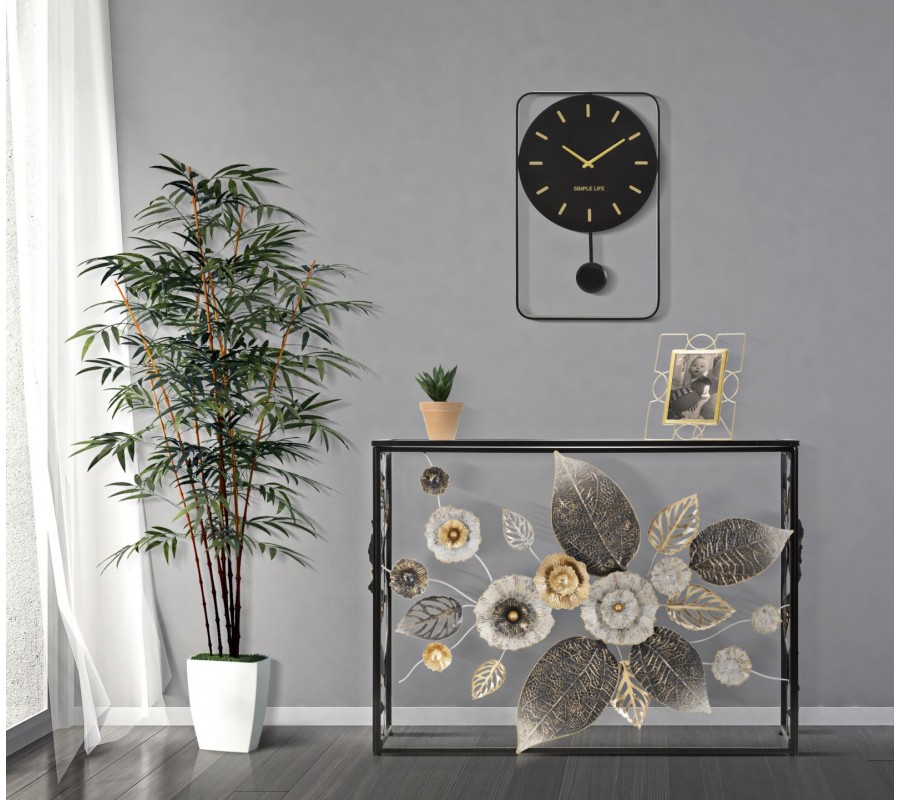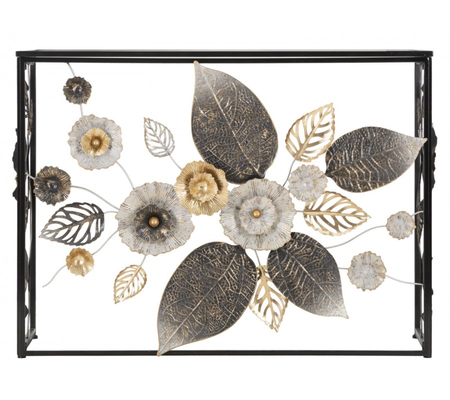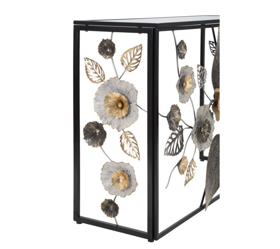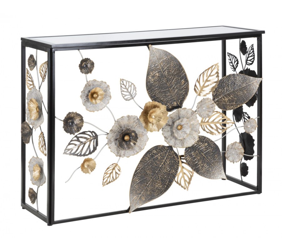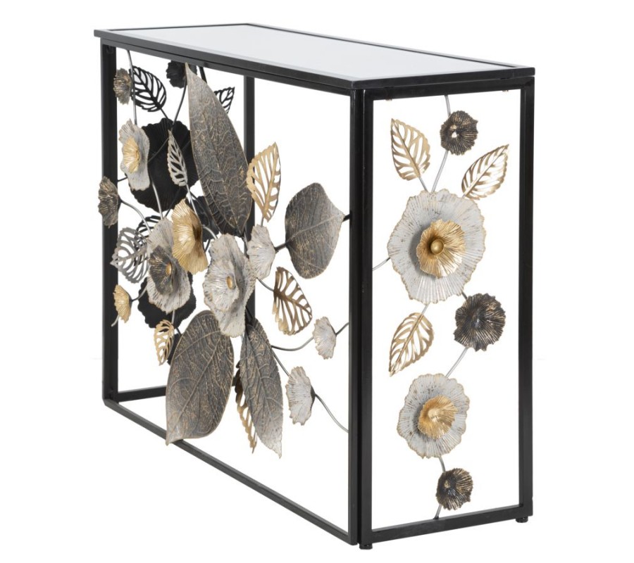 Konzolový stolík Florel je výrazným prvkom v interiéri, ktorý zaujme svojím detailne spracovaným kvetinovým vzorom. Kovová konštrukcia v čiernej a zlatej farbe je doplnená o prepracované kovové kvety a listy, ktoré vytvárajú umelecký trojrozmerný efekt. Zrkadlová sklenená doska dodáva stolíku elegantný nádych a odráža svetlo, čím vizuálne zväčšuje priestor.