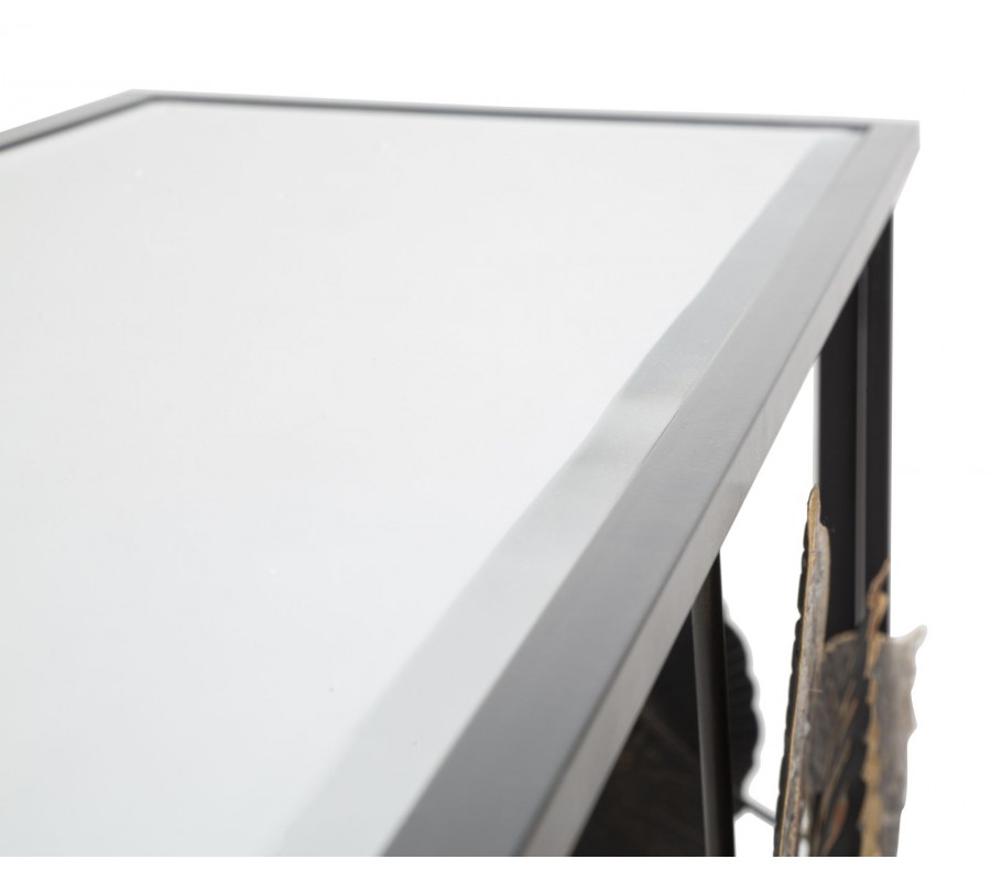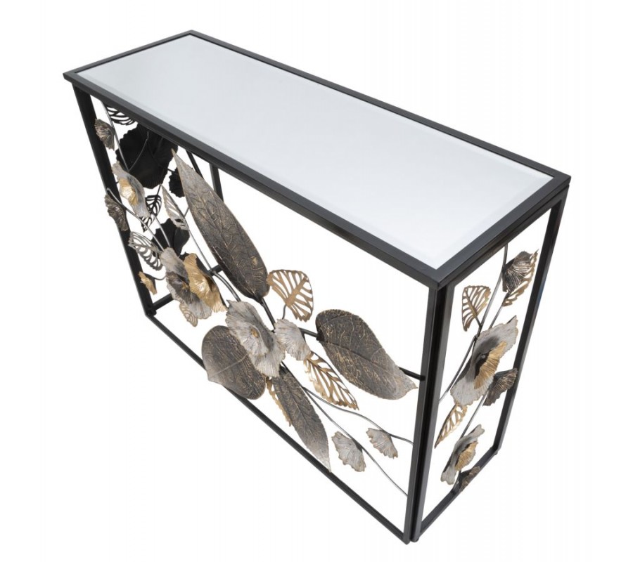Dizajnový konzolový stolík Florel s čiernou kovovou konštrukciou s kvetinovým motívom a zrkadlovou sklenenou doskou 112 cm