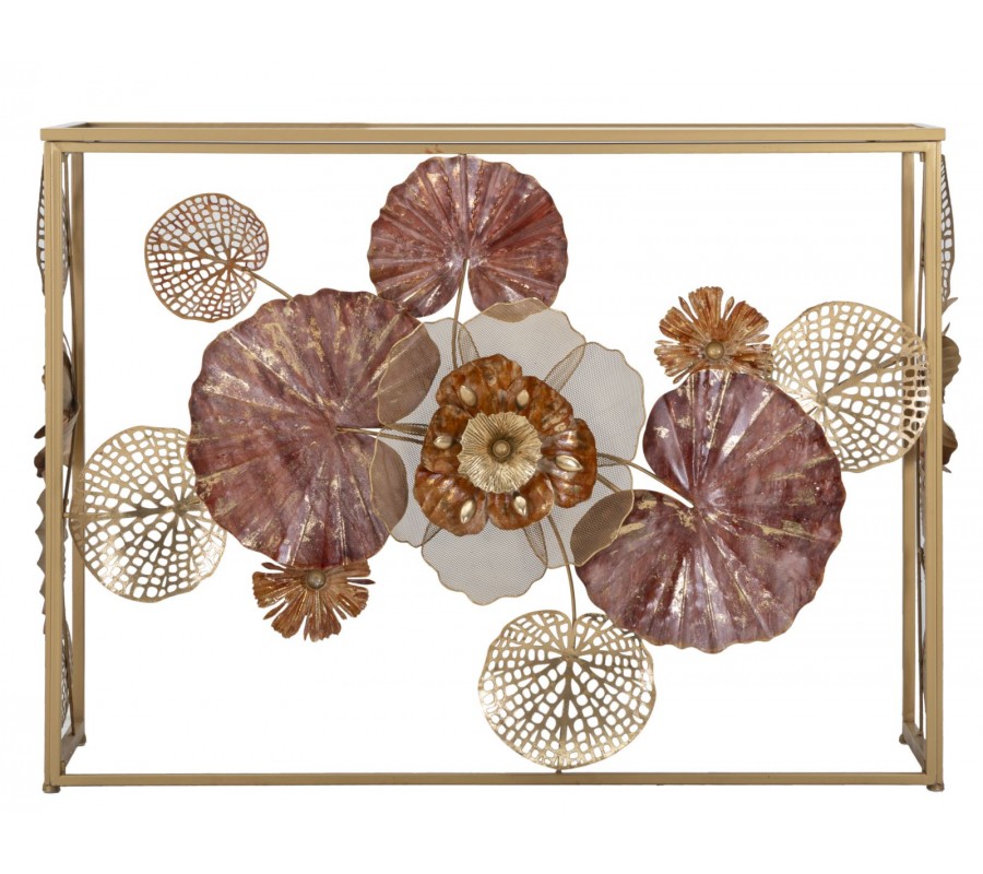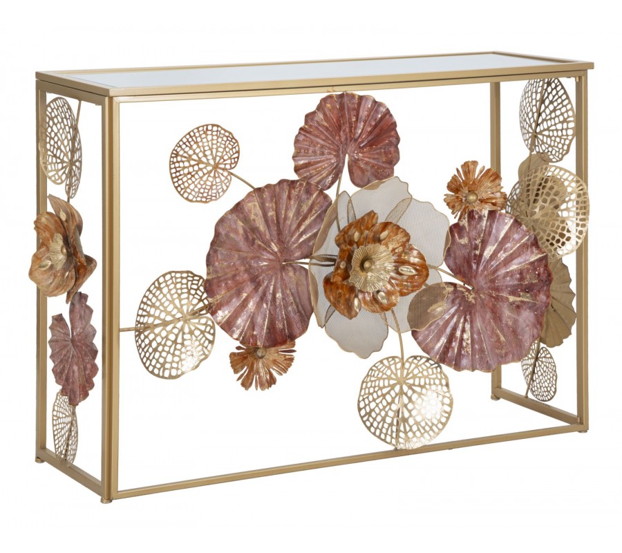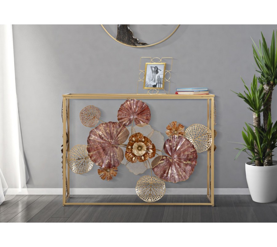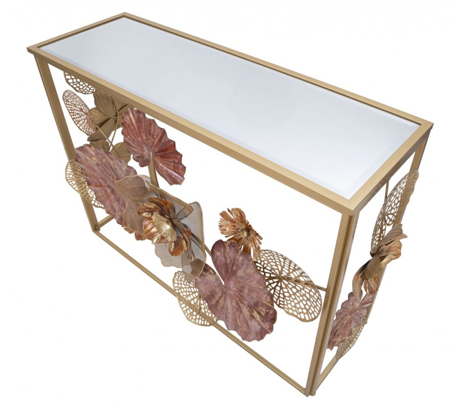 Dizajnový glamour konzolový stolík Floral so zlatou kovovu podstavou a florálnou výzdobou v odtieňoch ružovej a oranžovej 114 cm