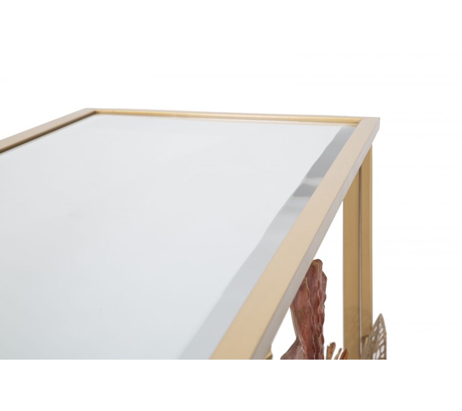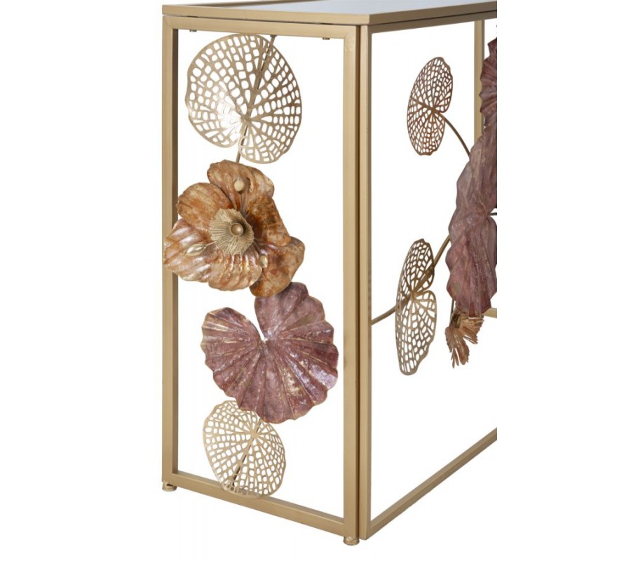 Konzolový stolík Floral vás očarí svojou bohatou florálnou výzdobou a luxusným nádychom glamour štýlu. Kombinácia zlatej farby a zrkadlového skla pomôže priestor presvetliť a kvetinové ornamenty zasa prinesú dominantný dekoračný element.