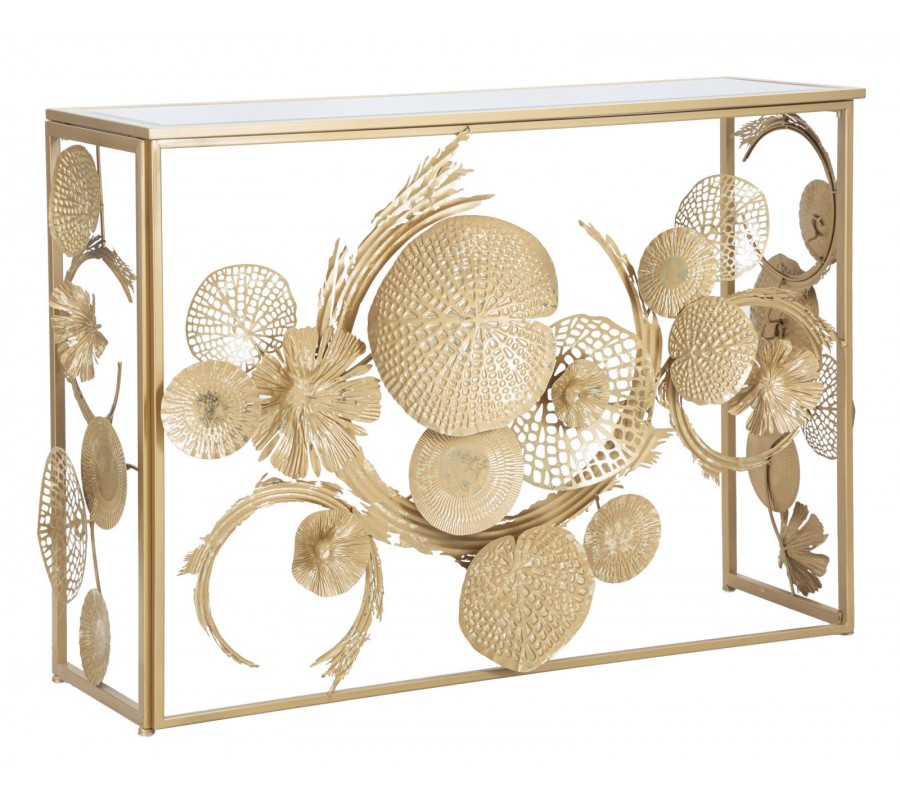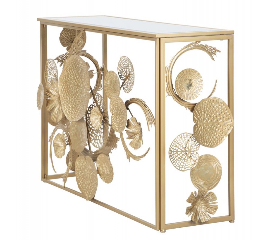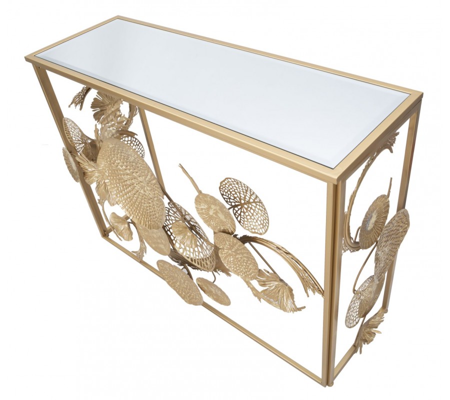 Dizajnový glamour zlatý konzolový stolík Floral s obdĺžnikovou zrkadlovou doskou a kovovou podstavou s florálnym zdobením 114 cm