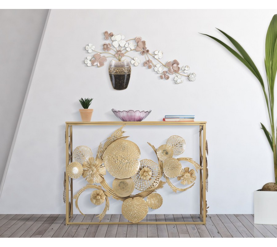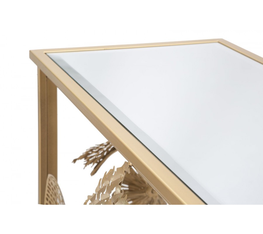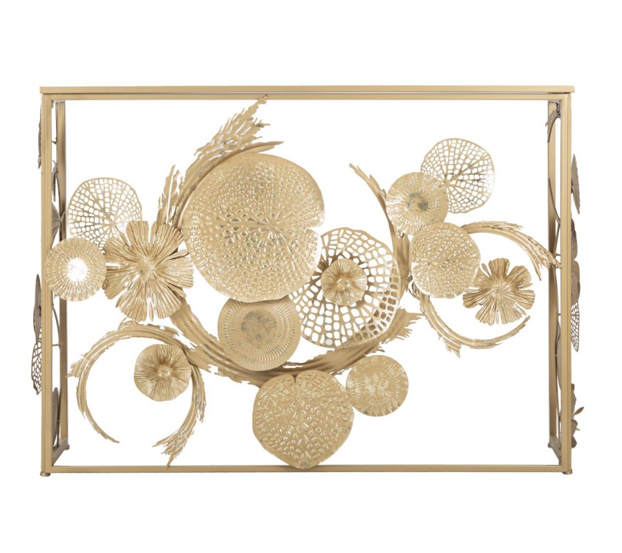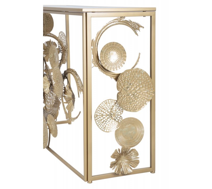 Konzolový stolík Floral bude dominantným dekoračným elementom vašej predsiene či obývačky. Očarí vás bohatou kvetinovou výzdobou a kombinácia zlatej farby a zrkadlového skla prináša do dizajnu štýlový glamour vizuál.
