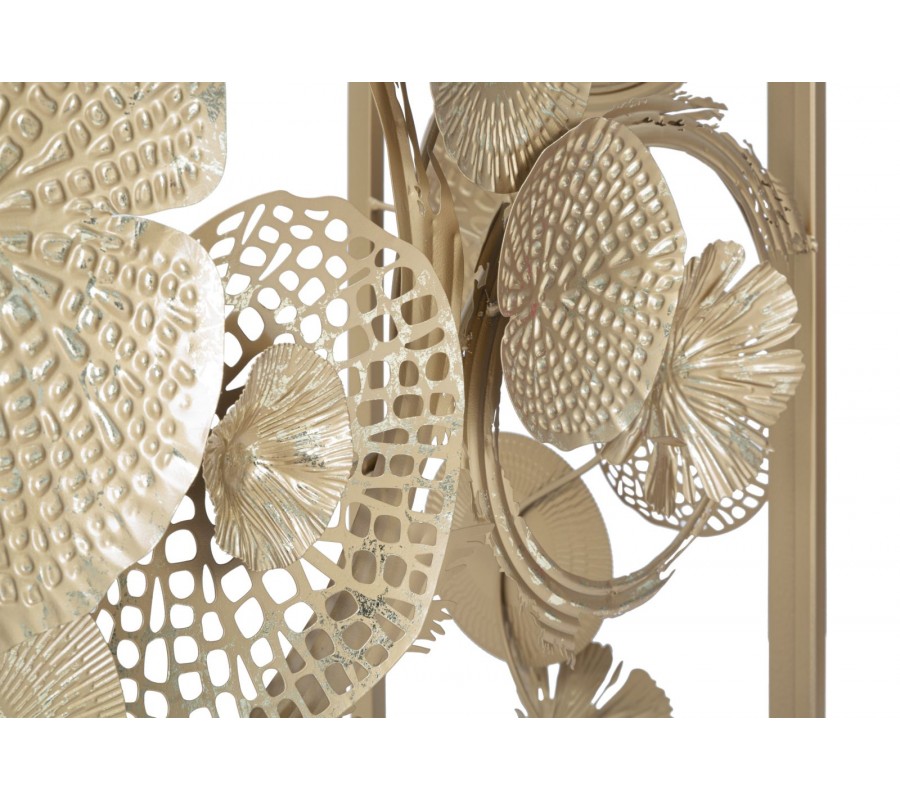 Podstava má žiarivú zlatú farbu a na základnej konštrukcii je upevnený komplikovaný dizajn z kovových ornamentov v rovnakom odtieni. Dôsledne prepracované detaily kvetín a listov pôsobia dynamickým dojmom a rôznorodé štruktúry vytvárajú bohatý vizuál.