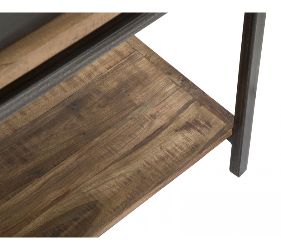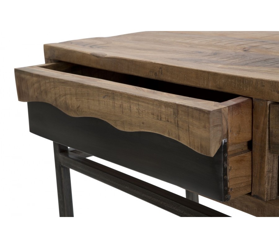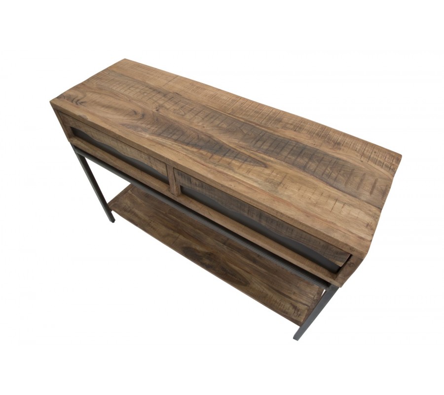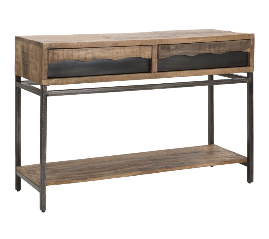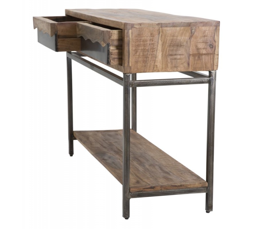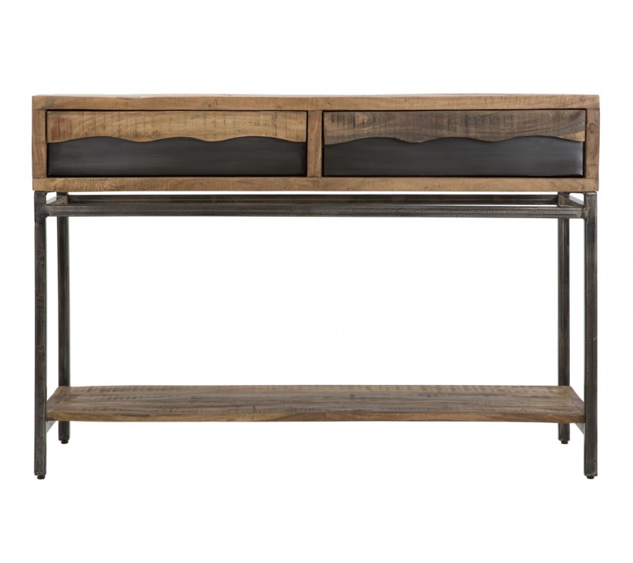 Industriálny masívny hnedý obdĺžnikový konzolový stolík Berignone s dvomi zásuvkami a poličkou s kovovými nožičkami 118 cm