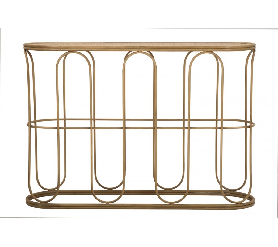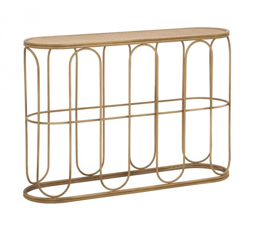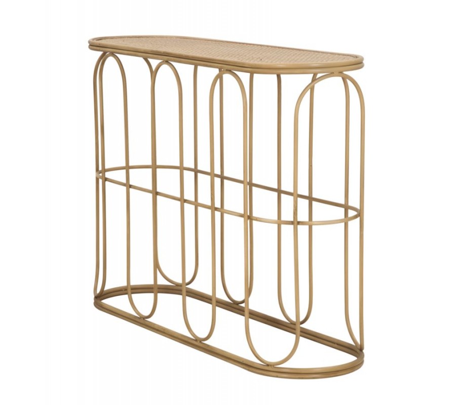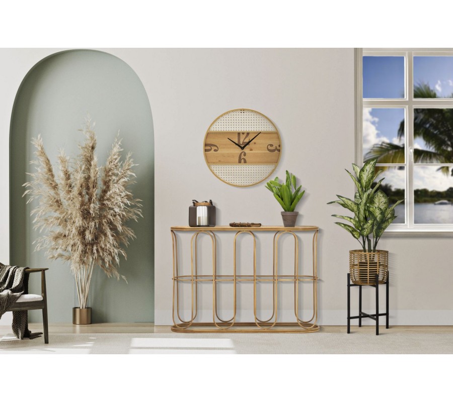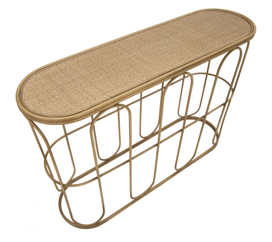 Konzolový stolík Ponio v sebe spája remeselnú precíznosť s moderným dizajnom. Jeho konštrukcia je vyrobená z prírodného ratanu v jemnom hnedom odtieni, pričom tenké, elegantne ohýbané ratanové prúty vytvárajú symetrický vzor prepojených oblúkov. Táto vzdušná štruktúra pôsobí ľahko, no zároveň zabezpečuje maximálnu stabilitu.