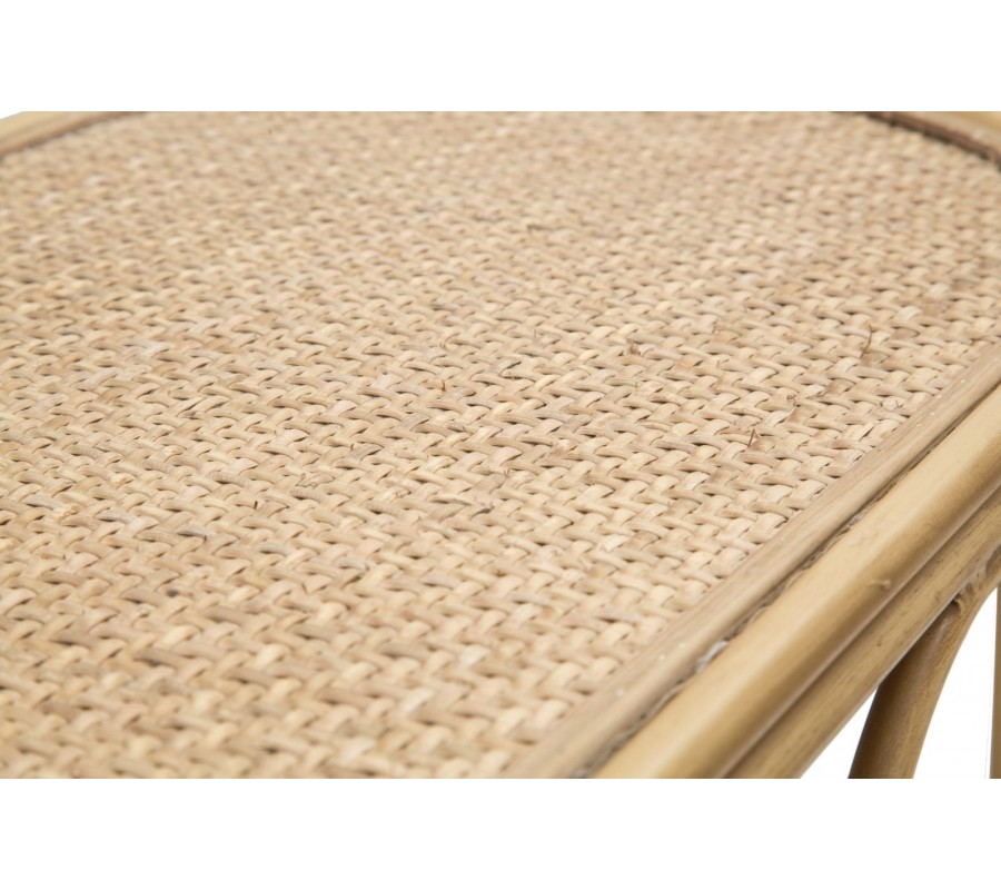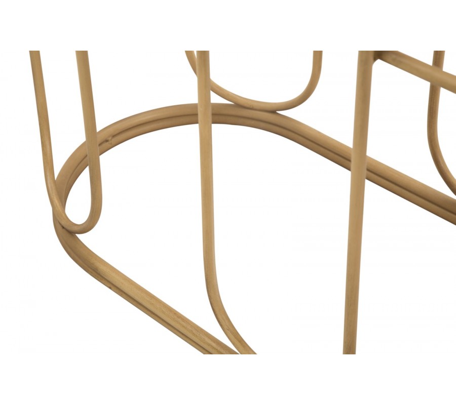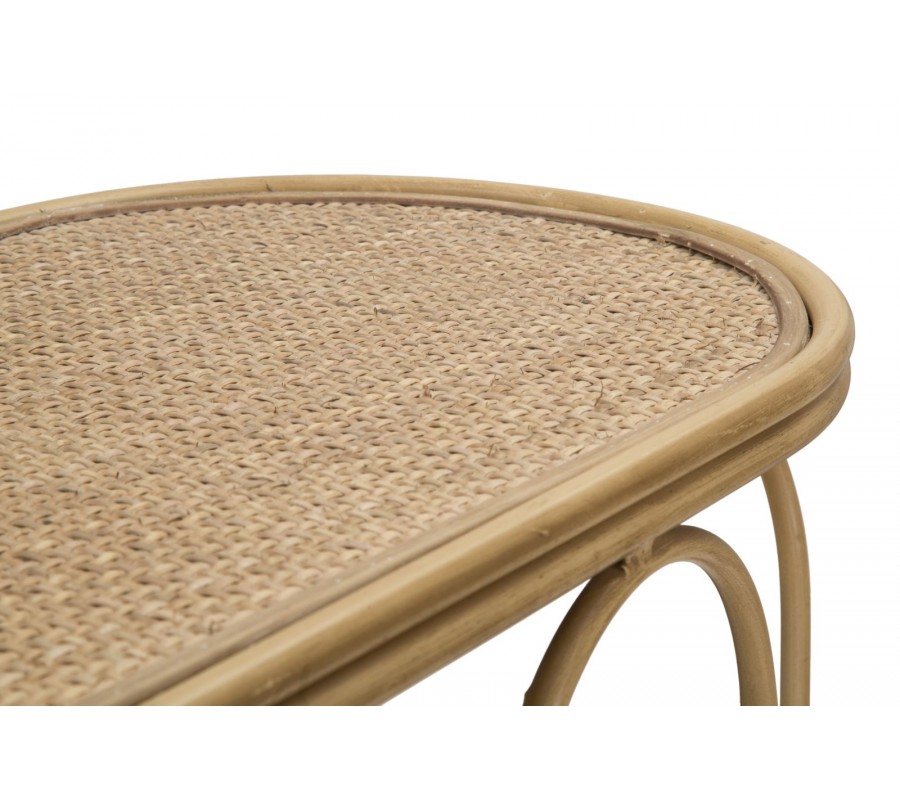 Vrchná doska má zaoblený tvar a na povrchu je zdobená ratanovým výpletom, ktorý vytvára jemnú textúru a zdôrazňuje prírodný charakter materiálu. Výplet je pevne osadený do rámu s hladkým zaobleným okrajom, ktorý dodáva dizajnu vizuálnu harmóniu. Celkový vzhľad stolíka je vďaka kombinácii geometrických oblúkov a prírodného materiálu nadčasový a ľahko kombinovateľný. Dolná zaoblená podstava zabezpečuje maximálnu stabilitu, no zároveň esteticky dopĺňa celkový dizajn.