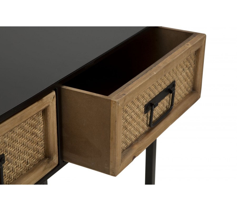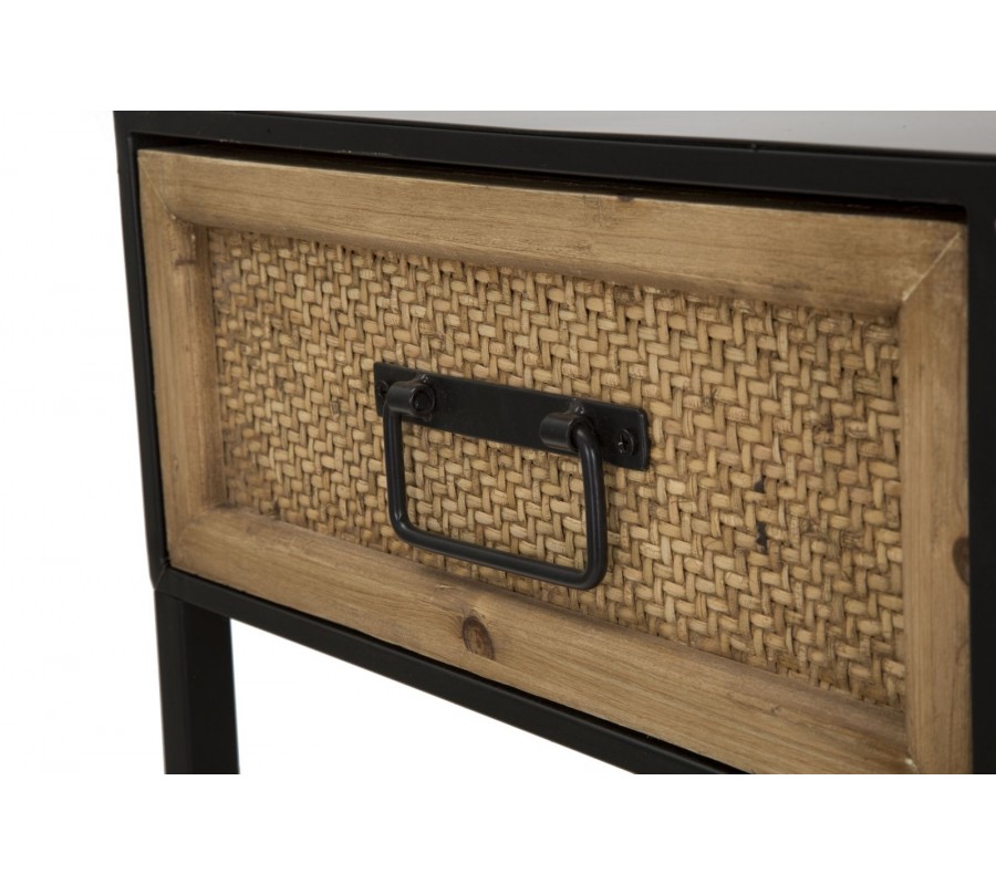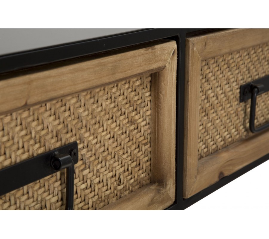 Horná časť je vybavená tromi zásuvkami, ktoré poskytujú praktický úložný priestor. Každá zásuvka je orámovaná drevom v prírodnom hnedom odtieni a zdobená výpletom so vzorom rybej kosti herringbone, čo dodáva stolíku autentický a remeselný charakter. Čierne matné kovové úchytky dopĺňajú celkový vzhľad a umožňujú pohodlné otváranie.