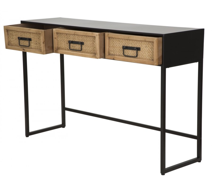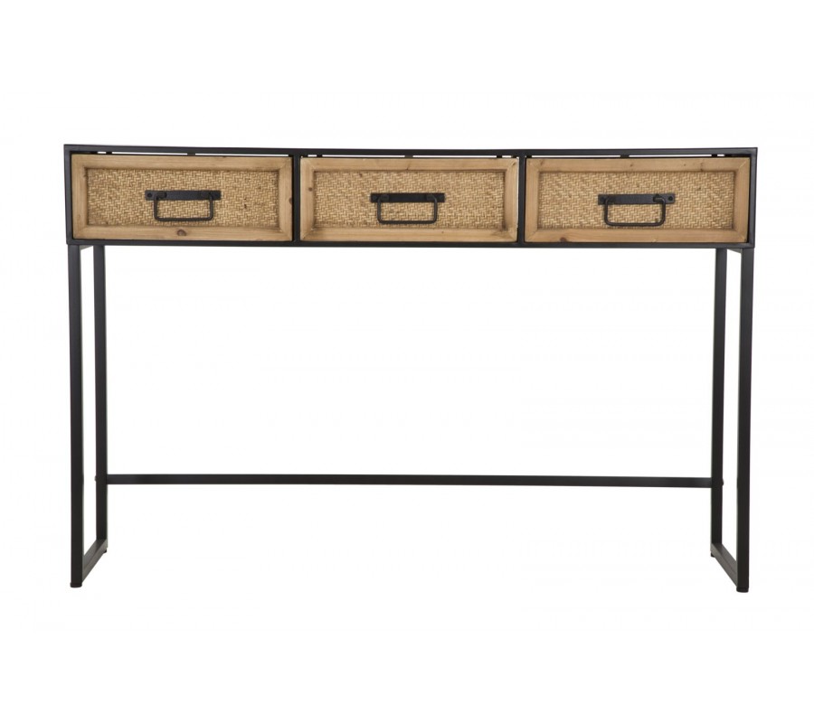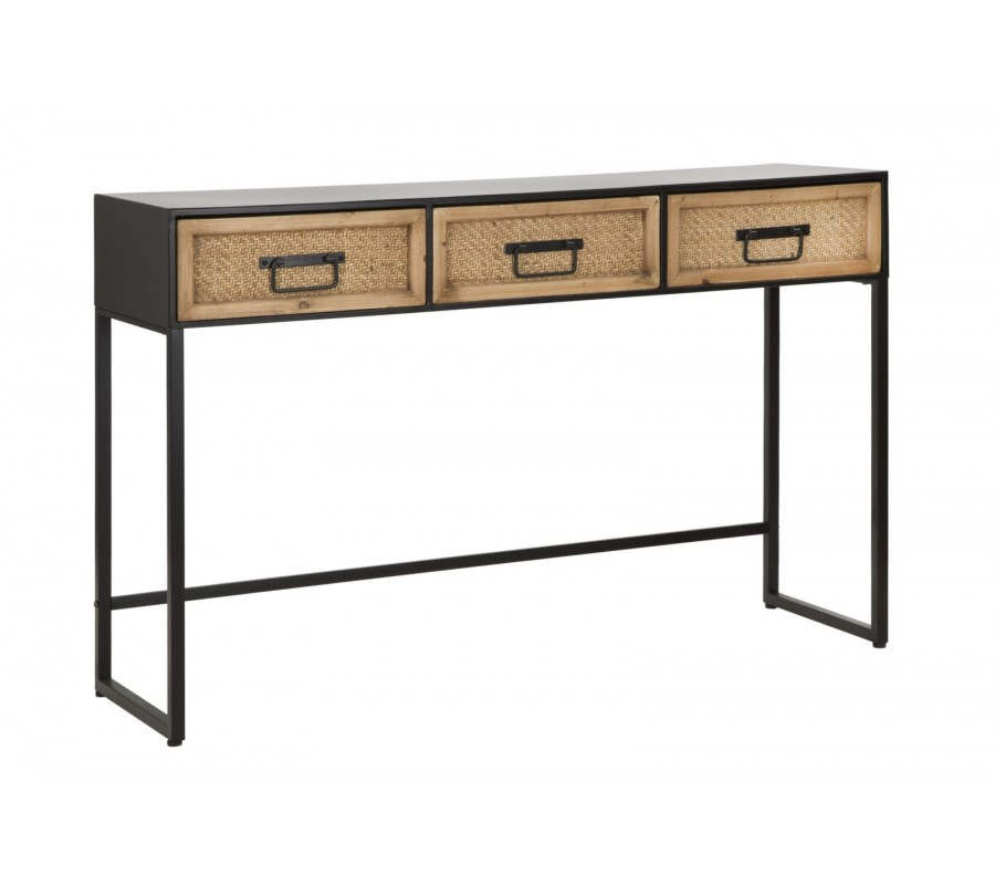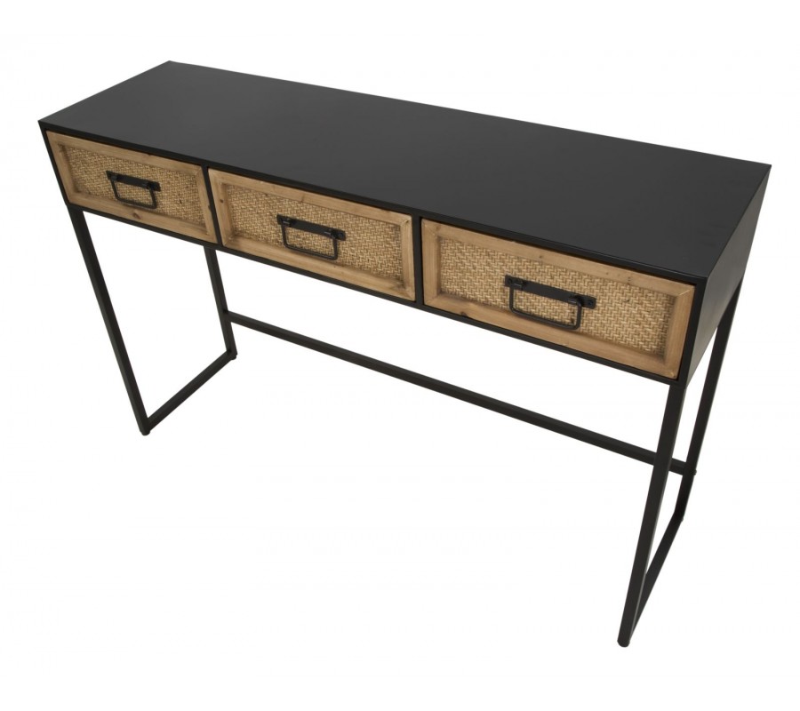 Industriálny obdĺžnikový kovový čierny konzolový stolík Herringbone s tromi zásuvkami s výpletom so vzorom s rybej kosti 120 cm