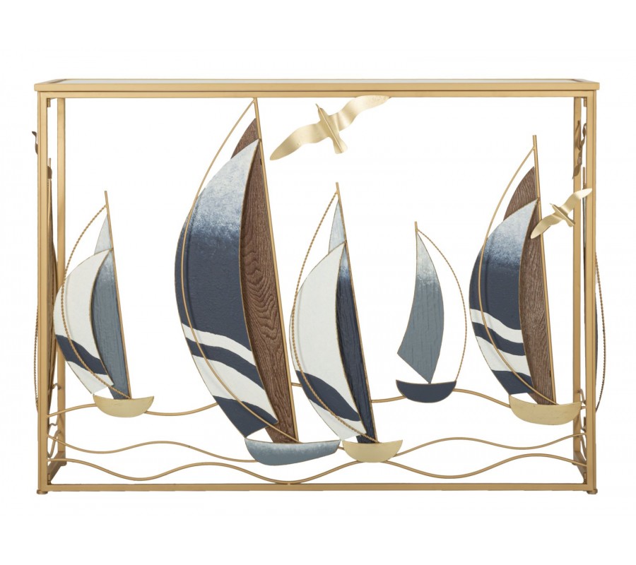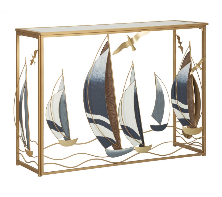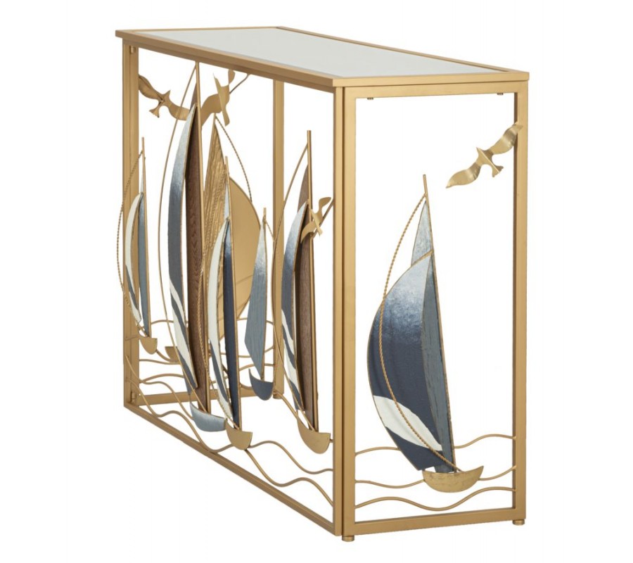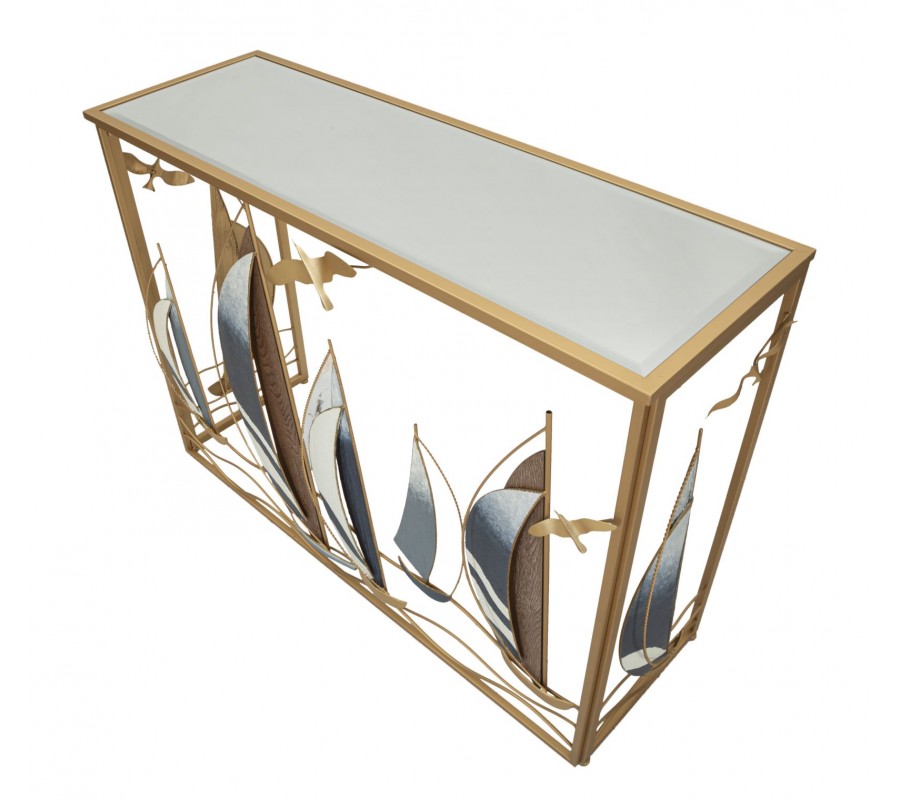 Konzolový stolík Navale prinesie do vašej predsiene či jedálne nádych stredomorskej atmosféry. Dizajnové zdobenie s motívom pôvabných plachetníc robí z tohto nábytku nie len praktickú odkladaciu plochu, ale aj dominantný dekoračný prvok miestnosti, zatiaľ čo kombinácia lesklého kovu a zrkadlového skla dodáva luxusný dotyk glamour štýlu.
