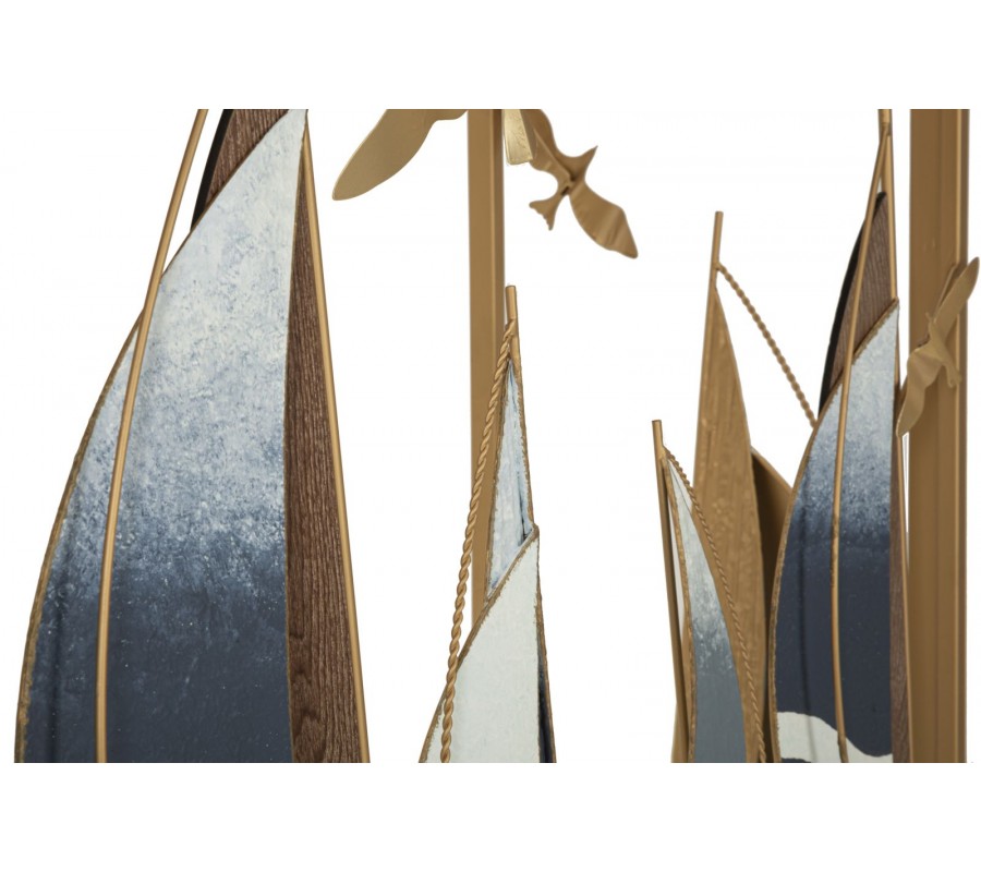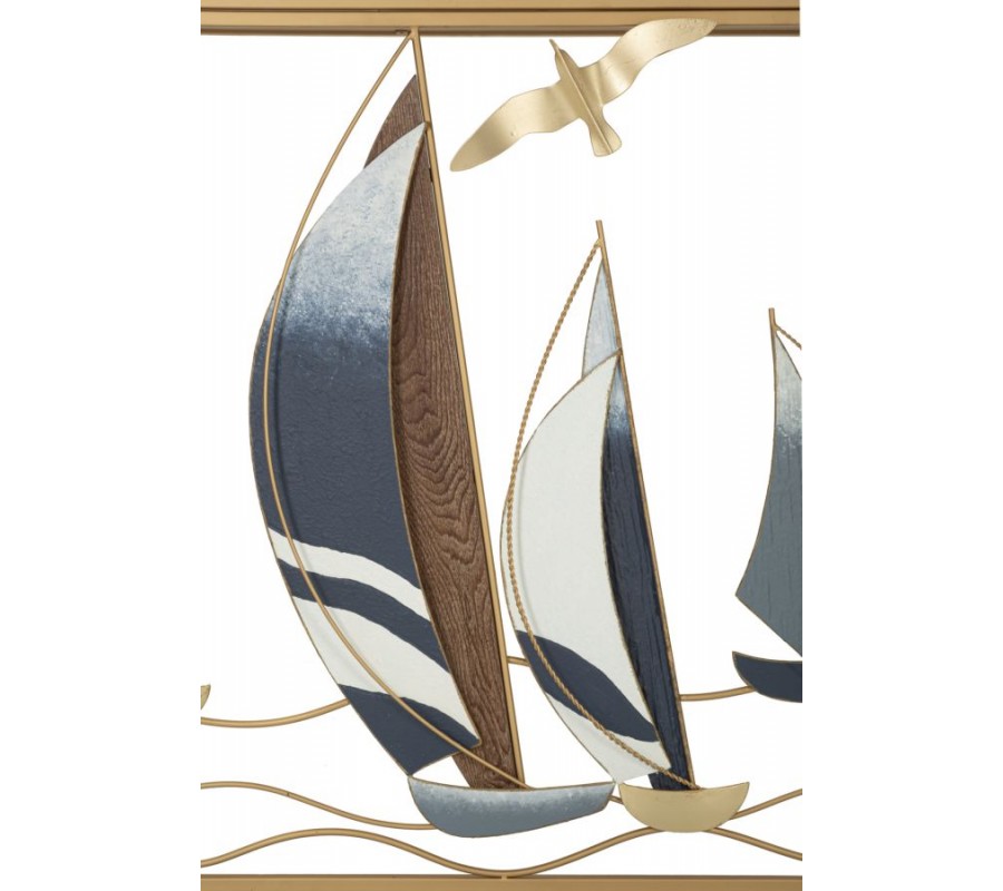 Rámy podstavy vypĺňa moderný dizajn, zobrazujúci plachetnice na mori. V spodnej časti sa nachádzajú zvlnené zlaté kovové prúty, naznačujúce vlny mora. Na nich sa vznášajú lode v rozličnej veľkosti, čo vytvára vizuálnu hĺbku. Na plachtách sú kombinované odtiene modrej a bielej farby, s hnedým dreveným akcentom. Scenériu dopĺňajú čajky v zlatom prevedení.