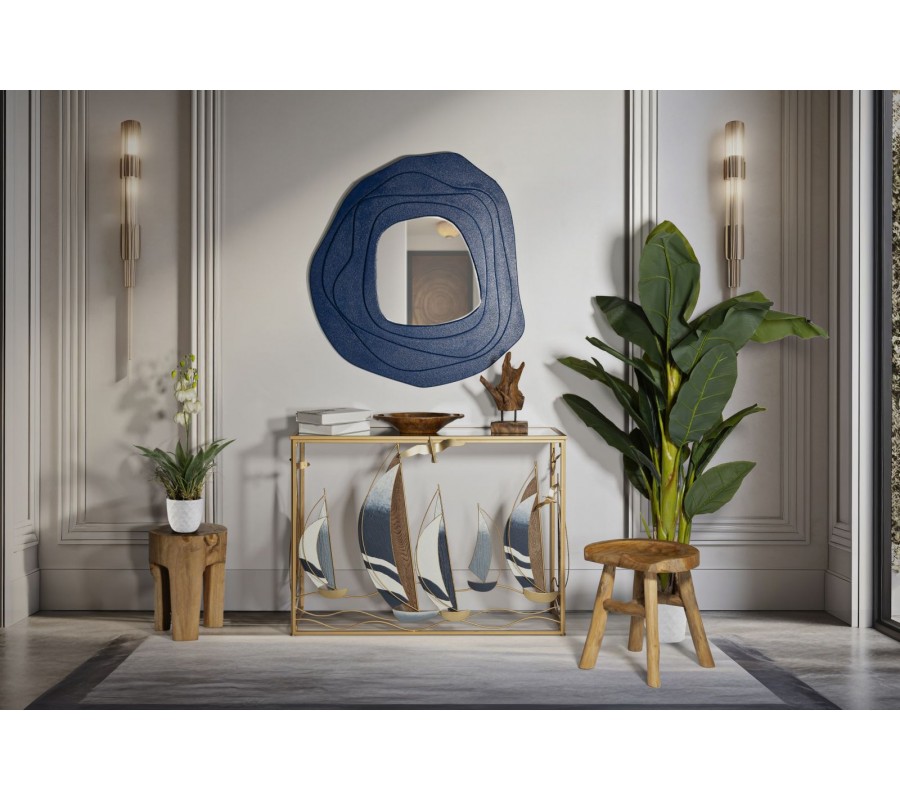 Dizajnový zrkadlový konzolový stolík Navale so zlatým rámom a motívom plachetníc s modrým akcentom 108 cm