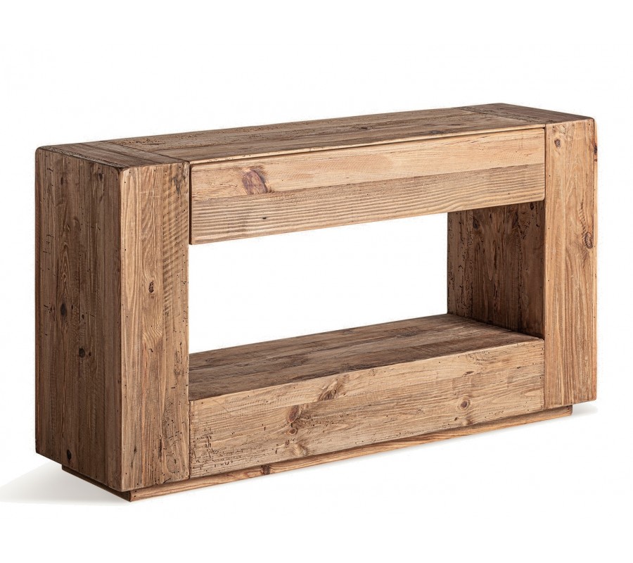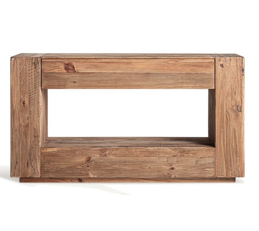 Luxusný rustikálny obdĺžnikový masívny konzolový stolík Poli v hnedom prírodnom vzhľade s otvorom s poličkou a zásuvkou 140 cm