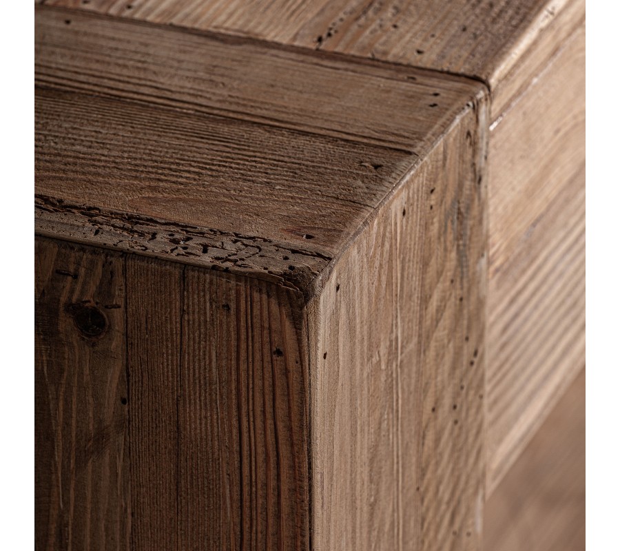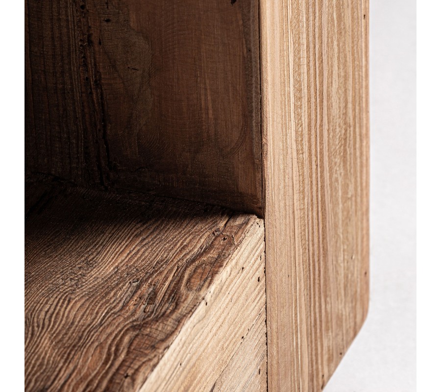 Stolík má perforovaný obdĺžnikový otvor, ktorý vytvára vzdušný dojem a zároveň poskytuje praktický úložný priestor. Spodná polica je ideálna na odkladanie dekoračných predmetov, kníh alebo košíkov. Súčasťou dizajnu je aj integrovaná zásuvka, ktorá je nenápadne vsadená do konštrukcie stolíka a poskytuje priestor na uloženie drobností. Stolík je vyrobený z recyklovaného dreva, čo mu dodáva autentický vintage charakter s remeselným ručným opracovaním.