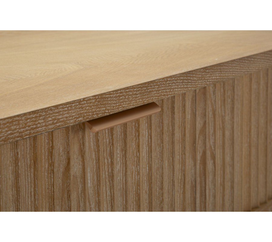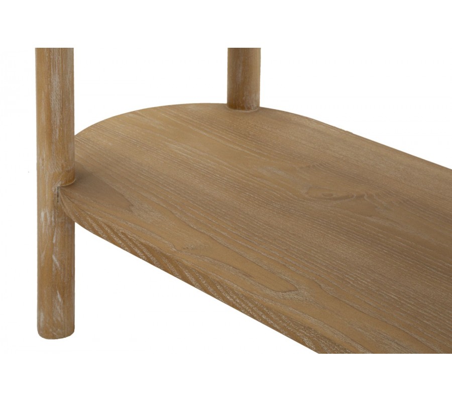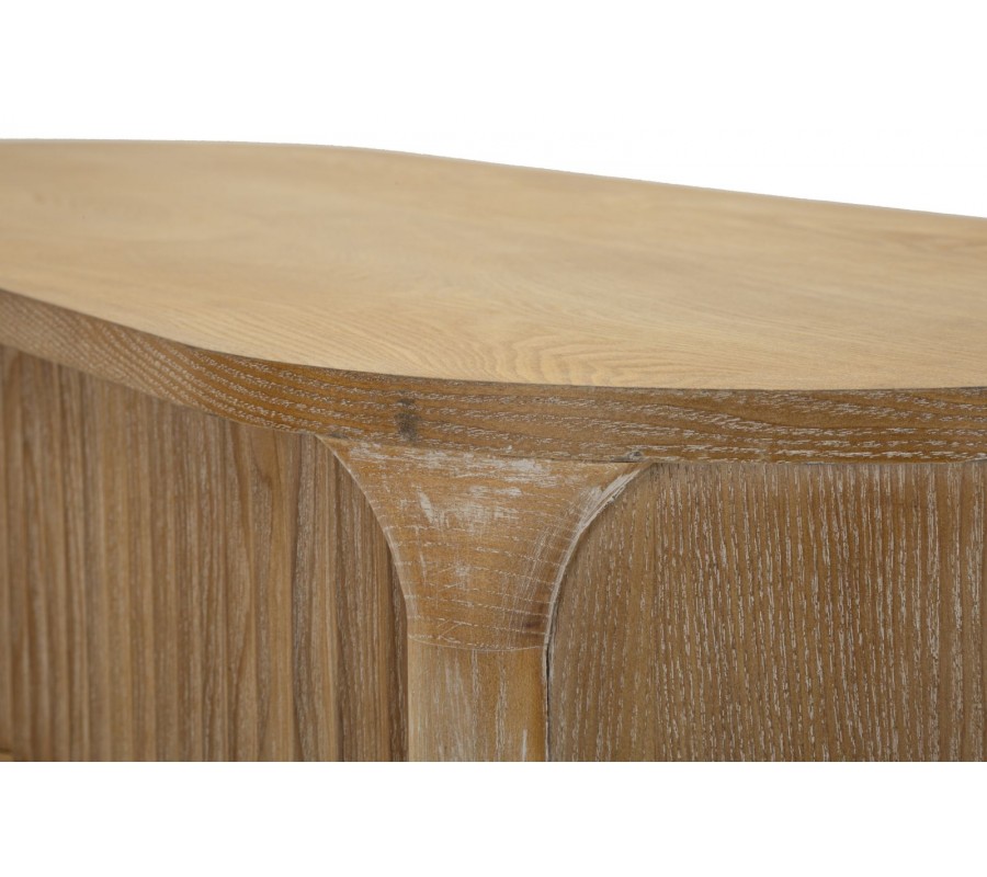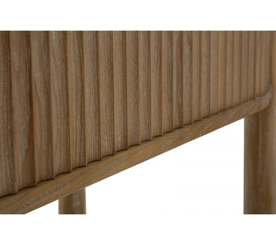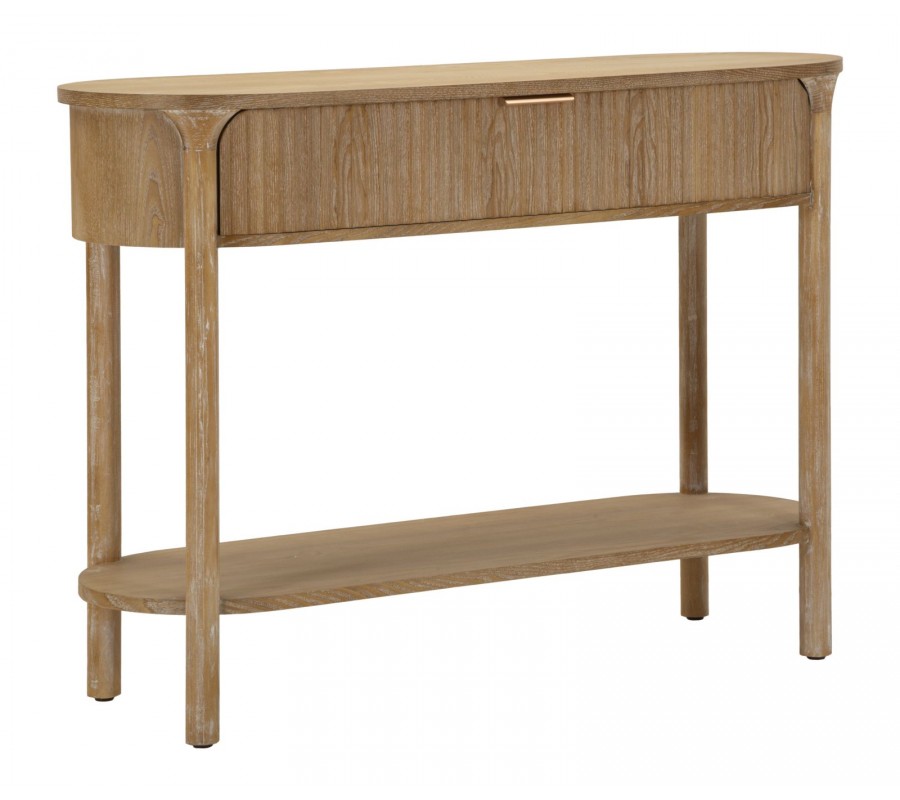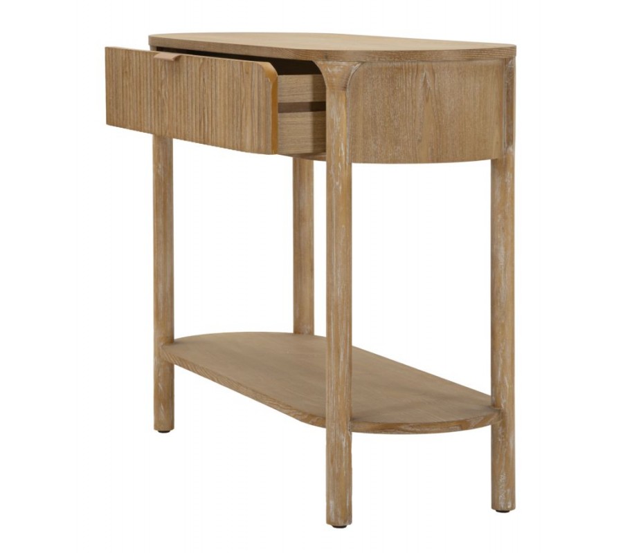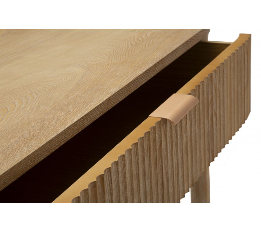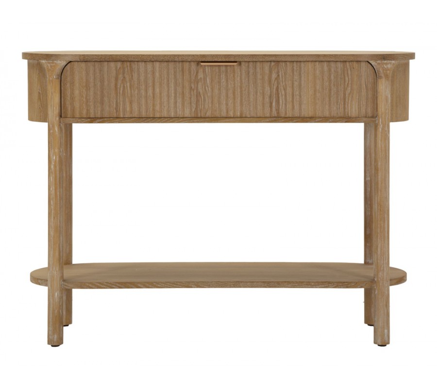 Konzolový stolík Meer vyniká jemným art deco dizajnom, ktorý kombinuje zaoblené línie, teplé tóny dreva a decentné kovové detaily. Jeho oválny tvar pôsobí mäkko a harmonicky, vďaka čomu sa hodí aj do priestorovo menších miestností. Povrch je vyrobený z kvalitného dreva v prírodnej hnedej farbe so zvýraznenou drevenou kresbou a dekoratívnym drážkovaním, ktoré sa tiahne po celej prednej strane zásuvky.