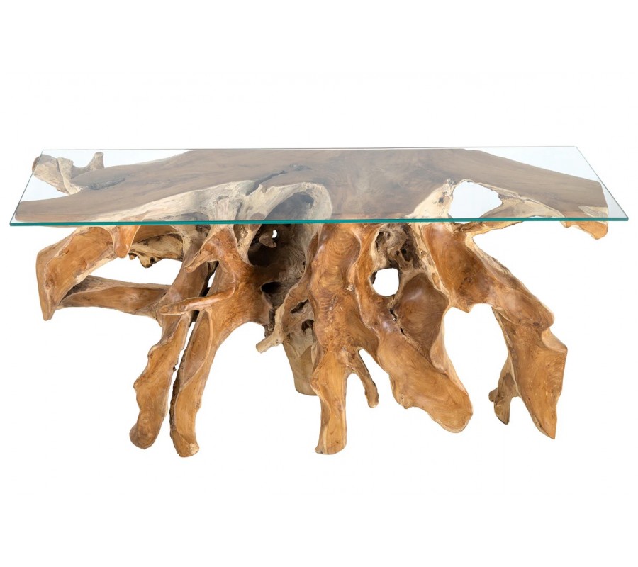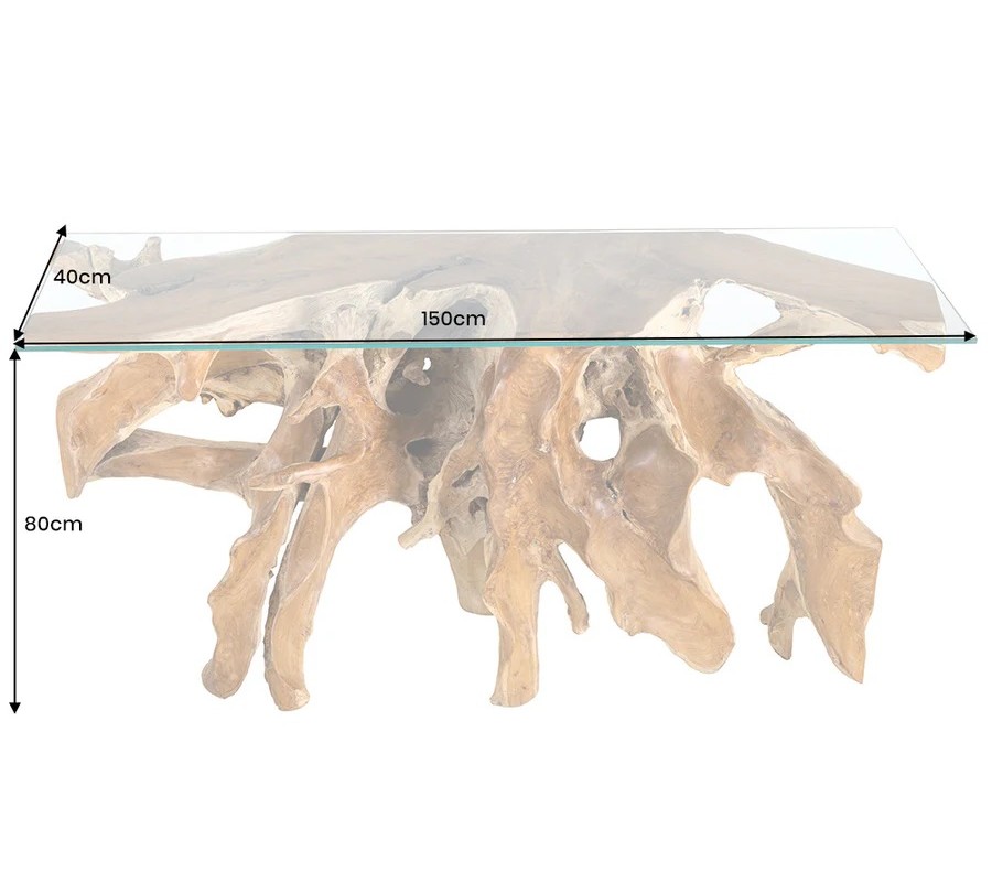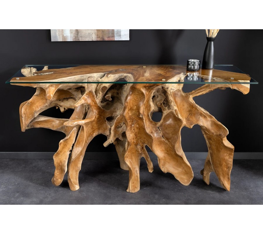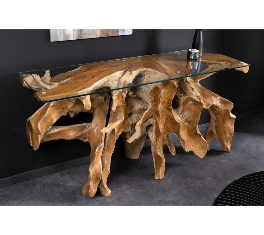Luxusný masívny konzolový stolík Root s organickou nohou z hnedého teakového dreva a sklenenou doskou 150 cm