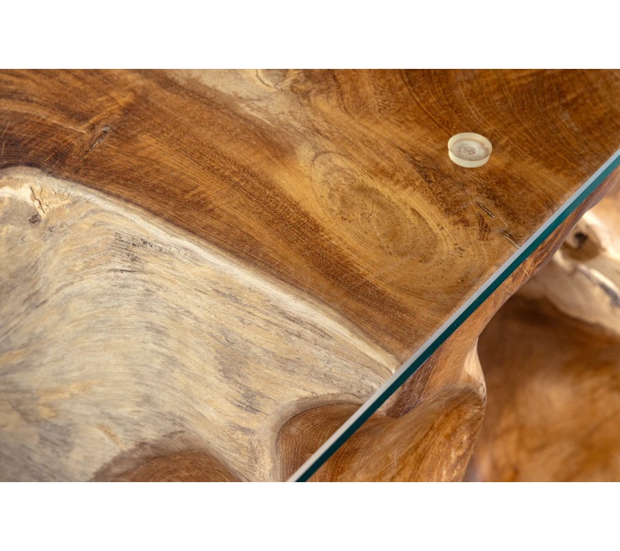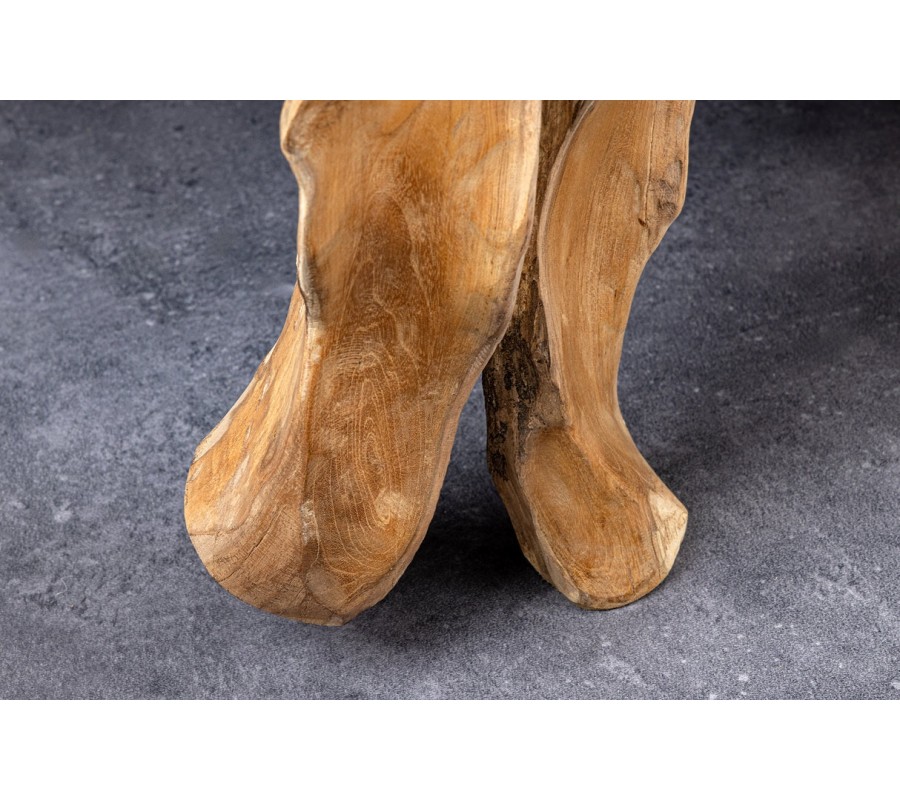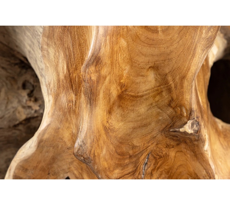 Stolíku dominuje masívna noha vyrobená z teakového dreva v naturálnom teplom hnedom odtieni. Má organický tvar pripomínajúci koreňový systém, so zrezanou spodnou časťou, čo zaručuje výbornú stabilitu nábytku. Povrch zdobia naturálne štruktúry, ako kresba letokruhov, uzly a praskliny, ktoré dodávajú každému kusu jedinečný a neopakovateľný autentický vizuál.