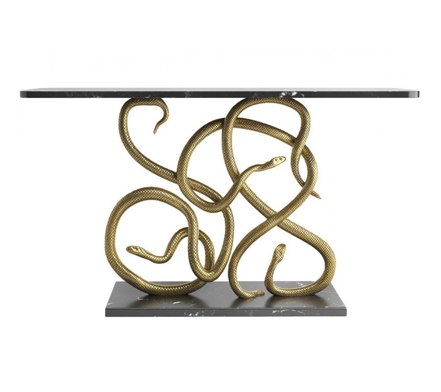 Glamour obdĺžnikový konzolový stolík Serpente so zlatými kovovými hadmi a čiernou mramorovou doskou 115 cm