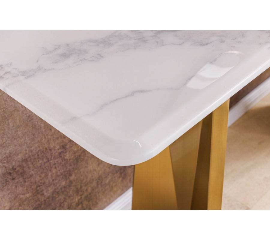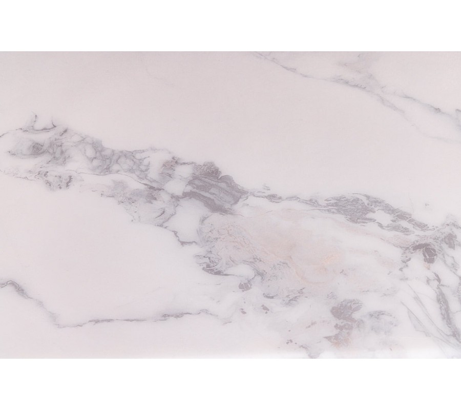 Stolík má obdĺžnikovú vrchnú dosku, vyrobenú z mramoru. Na mliečnom bielom pozadí sa odvíja jemné sivé žilkovanie a tento povrch zabezpečuje nie len exkluzívny vizuál, ale aj pevnú a odolnú odkladaciu plochu, ktorá nie je náročná na údržbu. Rohy dosky sú zaoblené a pôsobia tak jemnejšie. Lesklý povrch kameňa odráža svetlo a v spojení s bielou farbou pomôže priestor rozžiariť.