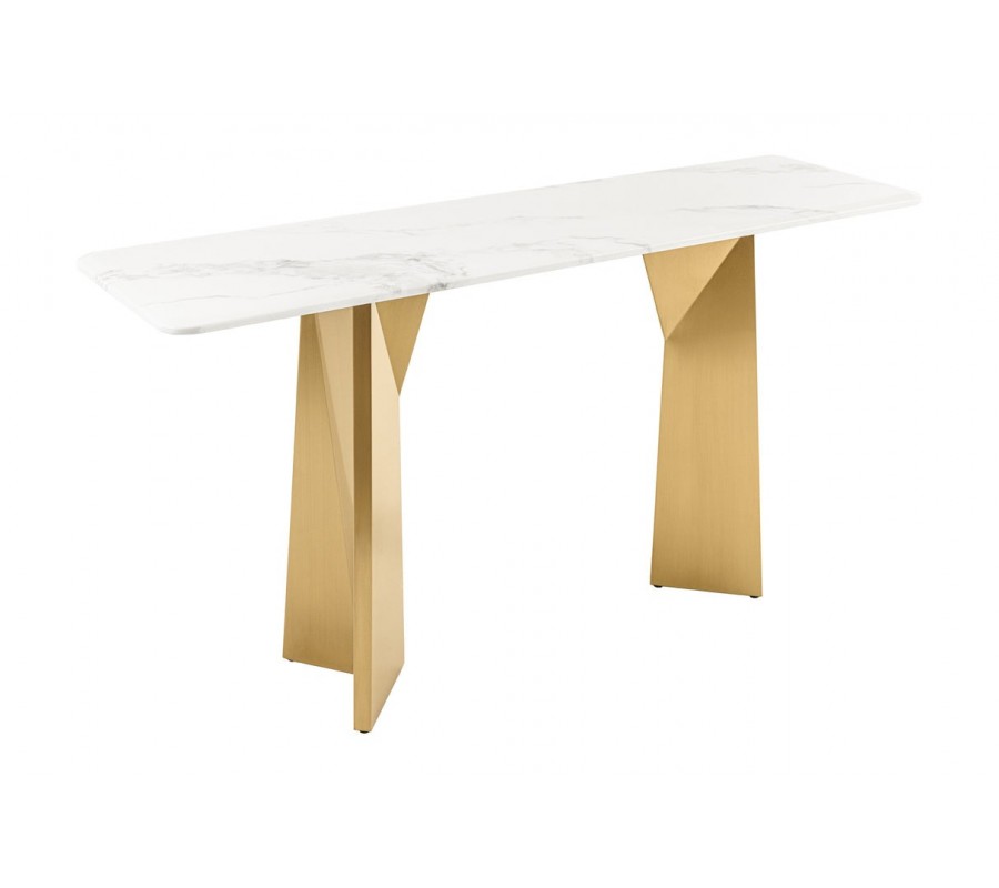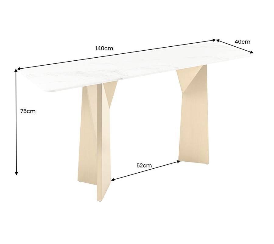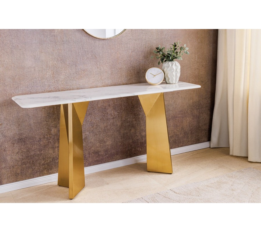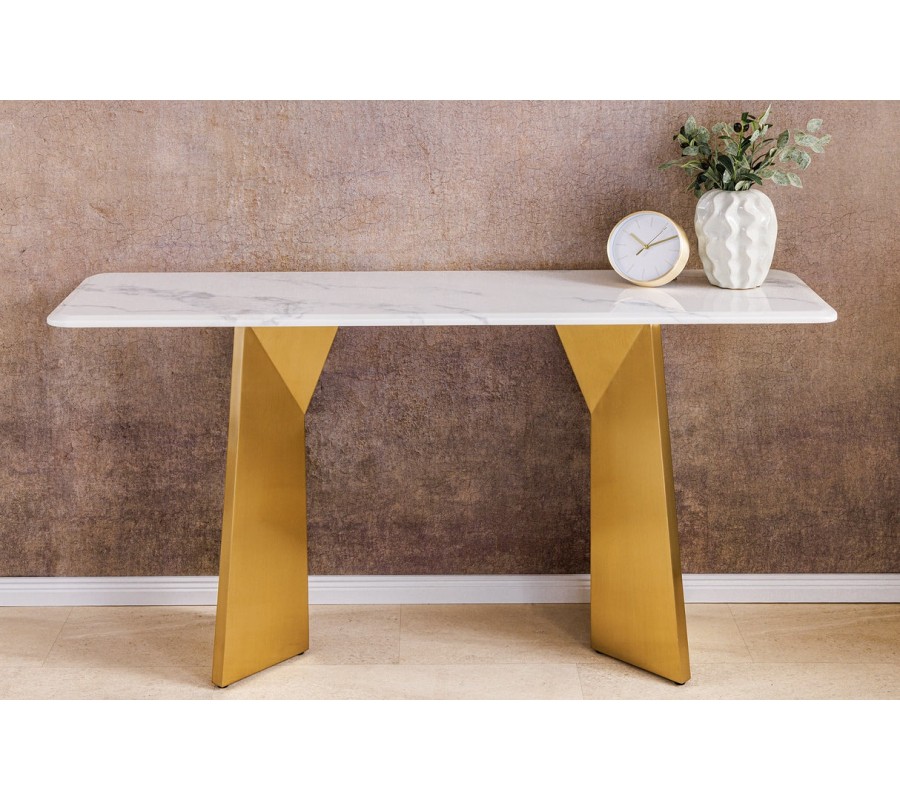 Luxusný mramorový konzolový stolík Hejdy s bielou doskou so sivým žilkovaním a zlatými nohami s geometrickým dizajnom 140 cm