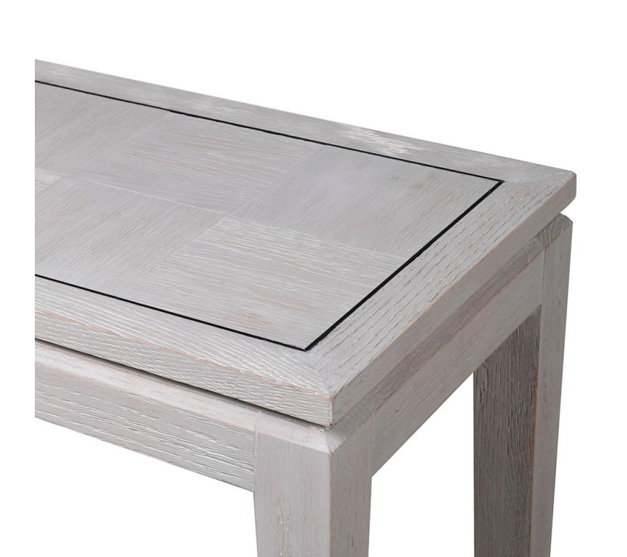 Konzolový stolík Quadria Blanca v sebe spája luxus s jemným moderným nádychom. Je vyrobený z masívneho dubového dreva v príjemnej svetlosivej farbe, ktorá si zachováva prirodzenú kresbu dreva a zároveň pôsobí štýlovo. Jeho kompaktný obdĺžnikový tvar z neho robí praktický a zároveň dekoratívny prvok.