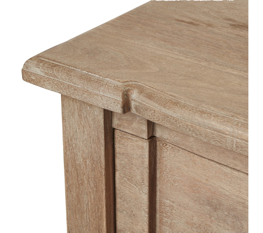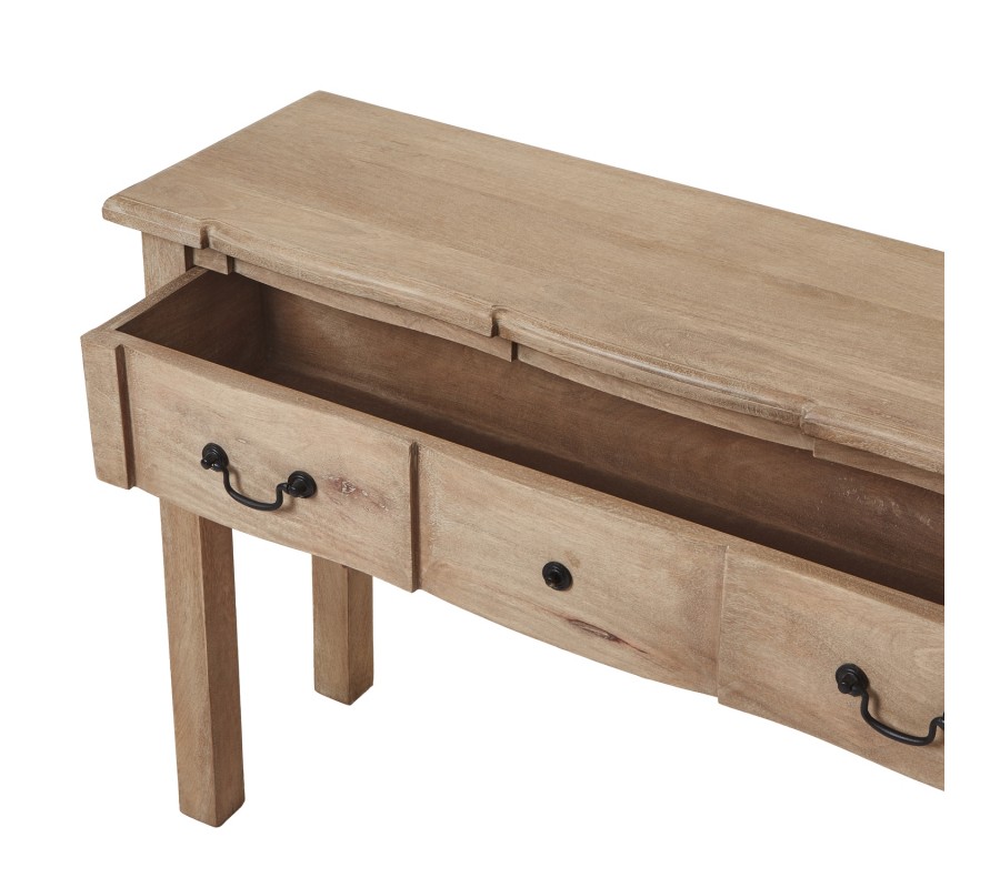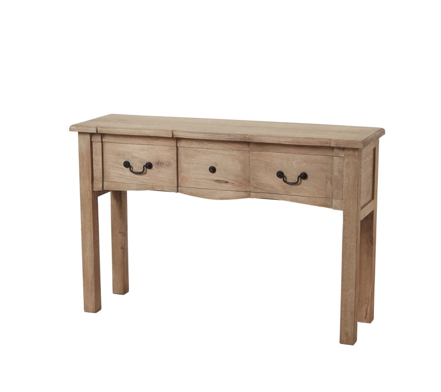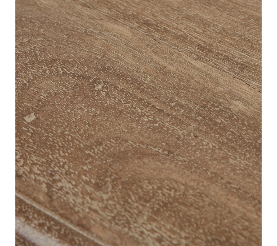 Konzolový stolík je vyrobený z masívneho dreva v svetlej hnedej farbe. Povrchová úprava zachováva jeho naturálne štruktúry, ktoré sú ešte zdôraznené svetlý, náterom s vymytým efektom. Usadená farba vytvára unikátny vintage vizuál, zatiaľ čo drevo pôsobí teplým dojmom.